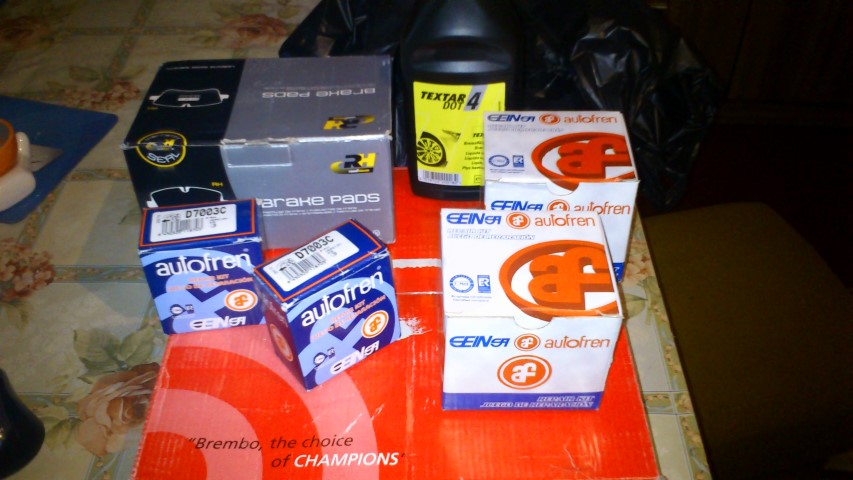 Ето ги прословутите водачи за които обещах да пиша. За жалост в комплектите на Аутофрен няма металната втулка. С малко закъснение но сега ми остана време да се занимавам с таралясника. Та в горния пост са ремонтни комплекти за предни спирачни апарати за пасат б5. Взех и някакви дискове Брембо... Вижда се, че имат антикорозионно покритие. Накладките (RoadHouse) ми ги препоръча човека в магазина, който го познават много добре тук и по други форуми, а именно ACE_Castrol (Влади) Не знам що за марка са ....Дисковете са 288 мм.