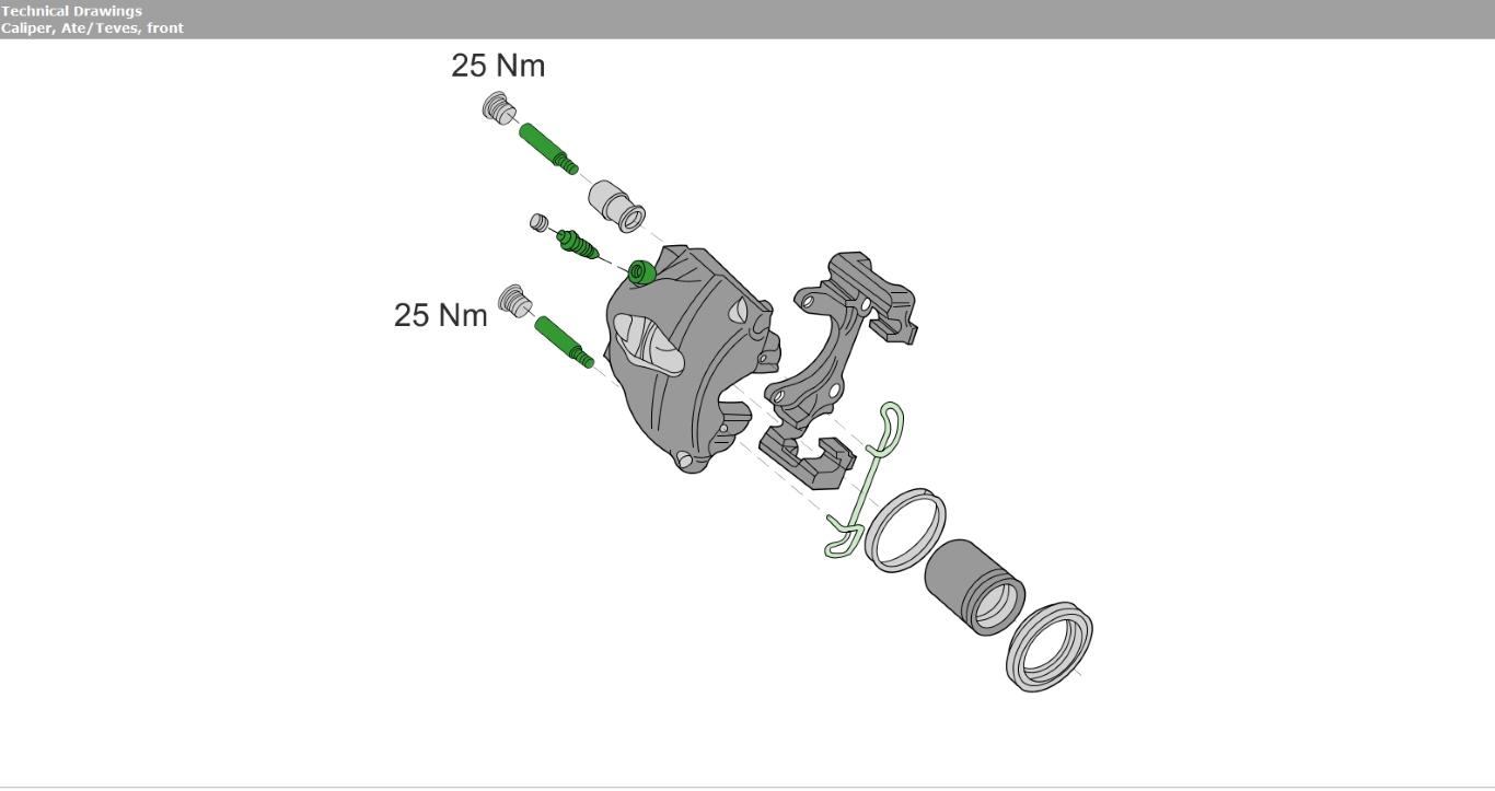 Другия вариант са 282 или 288 дискове, там системата е ATE. При нея водача представлява метална втулка, която е навита в супорта и на апарата има гумена втулка, която се движи по металната и така се движи апарата напред-назад. Там се продава ремонтен к-т с гумена и метална втулка и всичко може да се направи като ново, без да сменяш апарат или супорт. Между другото наскоро установих, че много лесно се минава от 282 на 288 при тези спирачки - сменя се само супорта и нови дискове с накладки...всичко става 1:1 и апарата си е същия. Оказа се даже, че 282 диска е доста по-скъп от 288 :) .Преди да сменяш водачи и т.н.,пак трябва да си убеден,че гумата е здрава и се движи добре по водачите,защото иначе пак ще заклинва.Пружината с номер 4 на картинката също е от много голямо значение за правилната работа на апарата и за това накладката да ляга правилно по диска - ако я няма или е много мека - ефекта пак е кривене на апарата. Ето как изглежда :