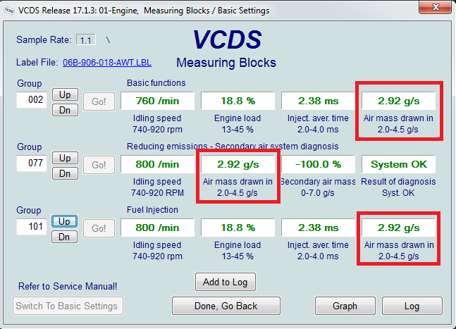 Докато бях в колата се сетих, че преди 2-3 седмици имах едно игране на оборотите и леко потрисане на колата, което беше директно свързано с брояча на мисфайърите, но се оказа една от свещите. Въпросът е, че тогава свалих дросела и го почистих, след което му направих адаптация с VCDS в 01-Engine -> Basic Settings -> 060. Не съм сигурен, че има пряка връзка с проблема с оборотите, но реших да го споделя.