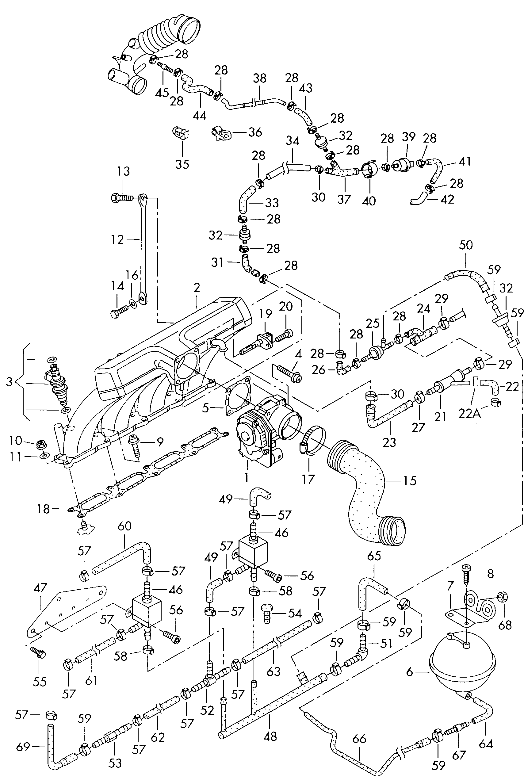 Аз лично бих се помъчил сам да открия къде е проблема, ето ти схема на всмукателния тракт на колата да видиш и проследиш всички вакууми и маркучи.