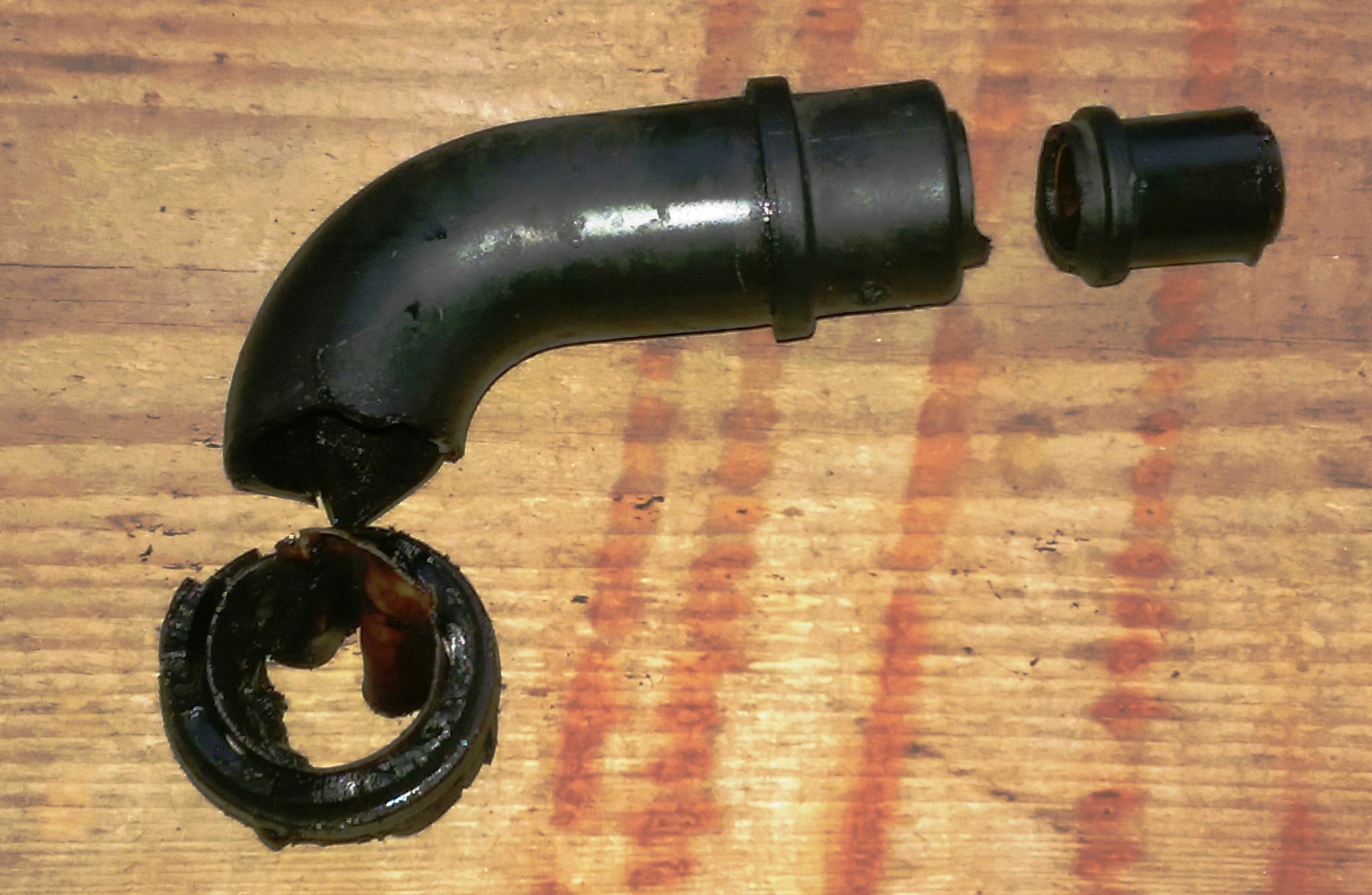 Тази тръба е пластмасова, близко е до корпуса на мотора и след 20 години е тотално разпаднала се.