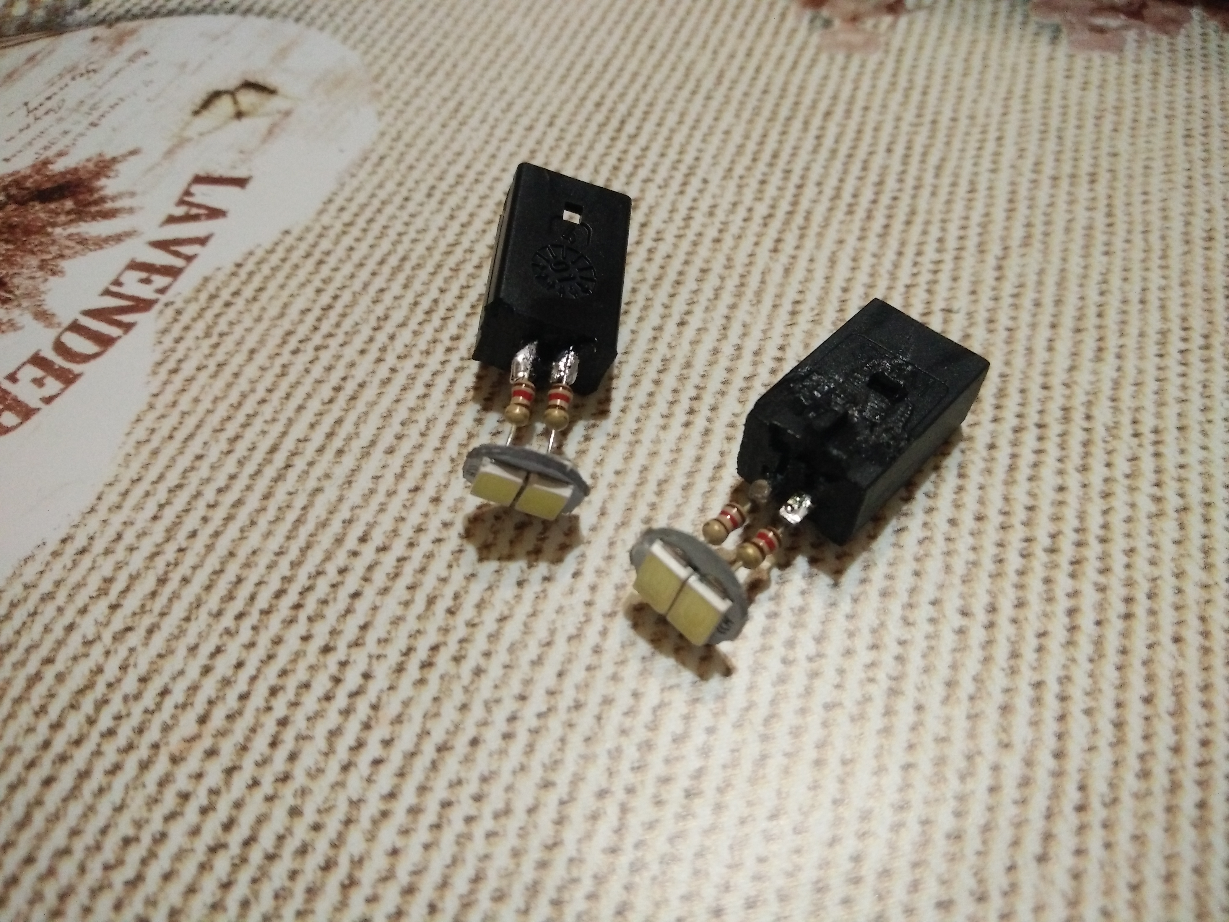 Когато отидох в магазин за електронни компоненти ми казаха че диодите не трябва да са на на 12 волта и за това се слагат съпротивленията. Купих си диоди и съпротивления и ги смених на всички духалки. Малко зор докато ги изкарам ама с малко от вълшебните заклинания(мамата и.т.н) успях да ги извадя. Поставянето и връщането братно беше по лесно . Сега всичко си свети както трябва
