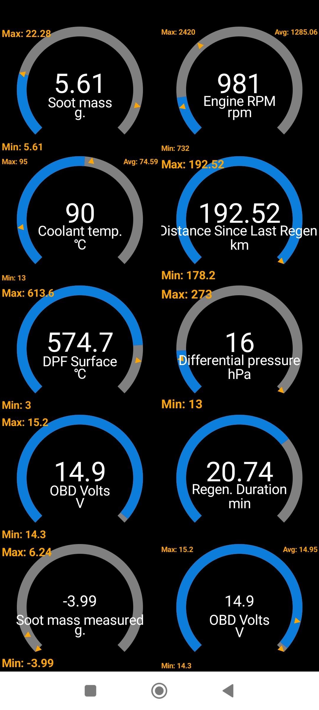 Усетих, че започва регенерацията пуснах VAG DPF. Карах градско и на няколко пъти колата беше под пълен товар - кикдаун на спорт с цедене на 2-3-4 предавка, но и доста каране по-бавно без товар, защото няма как в града да е иначе. Приключи за около 35 мин. Не видях каква е стойността на празен ход, но видях максимална стойност 720 на диференциалното налягане. Това означава ли, че имам датчици за смяна?
