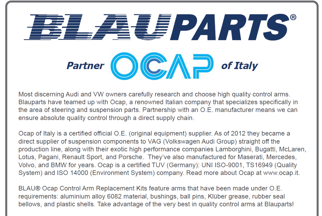 Здравейте колеги. Попаднах на компания произвеждаща компоненти по окачването за VAG групата. В техен бюлетин се твърди, че от 2012г. са официален доставчик на части за VAG. Сайта им е www.ocap.it а аз попаднах на марката в ето този сайт http://www.blauparts.com/audi_parts_vw_parts.asp Цените дадени там варират от 450$ до 600$, което е добре ако наистина са О.Е. Имаме колеги в Италия ( колегата Aprillia например ) , които могат да проверят информацията и да напишат няколко реда тук да разберем дали е истина всичко това. Ето и малко интересна информация в картинки от техен бюлетин. До колкото разбирам от едната картинка, тампона на долен заден носач ( кривия ) е хидравличен! Мисълта ми е, че имаме колеги, които могат да си позволят комплекти като LMO, които не са евтини и за това пускам този пост. Може би наистина са с качество за първоначално вграждане а и цената не е като в Порше :)