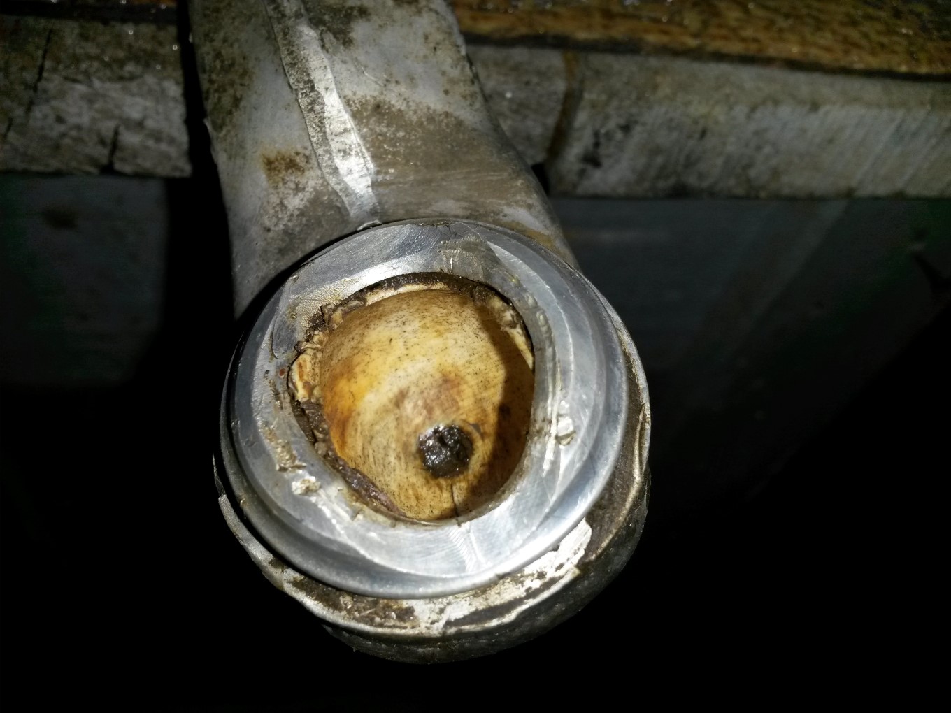 Тук виждаме положението в самата шарнирна връзка. Виждате пукнатината до къде е и липсата на материал от тази страна.