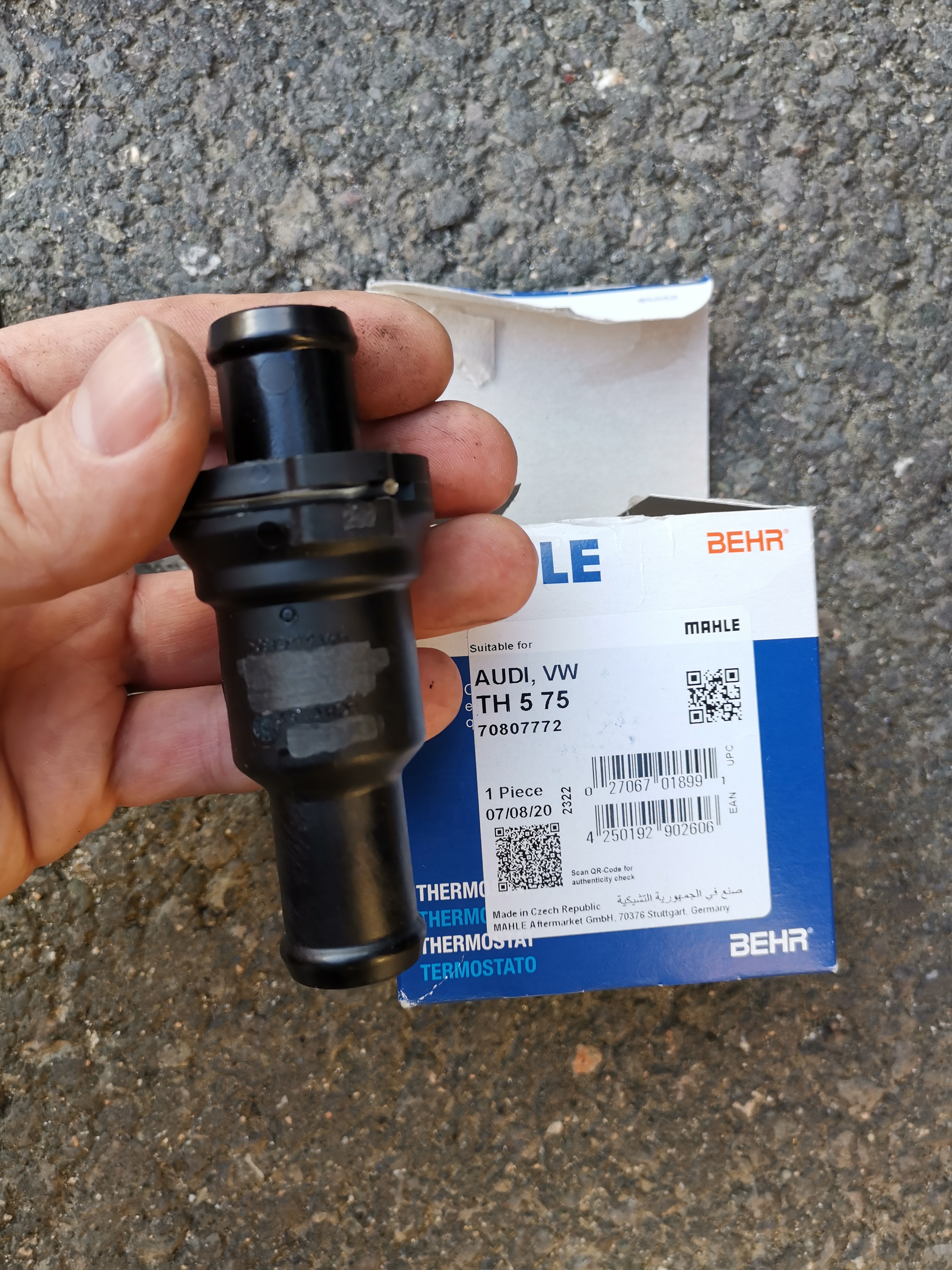Смених и аз термостата преди малко, в обедната почивка, 25мин след описанието на колегата Добрин на 3та страница. Елементарно е, забавих защото си падам перфекционист и намествах скобите по отпечатака както са си били и си оцапах ръкава нас атифриз :)..Ползвам печка и си ми беше топло и не обръщах внимание, но имах съмнения за малкия термостат, само с по агресивно каране дигаше 90гр., а после изтиваше на 68гр. Стария, очевидно оригинален вече мога да ползвам спокойно за шнорхел, блокирал е отворен, новия е какъвто имаше в нета Mahle/BEHR TH 5 75 . Търсих оригинален, но не намерих в нета. Колкото изкара.