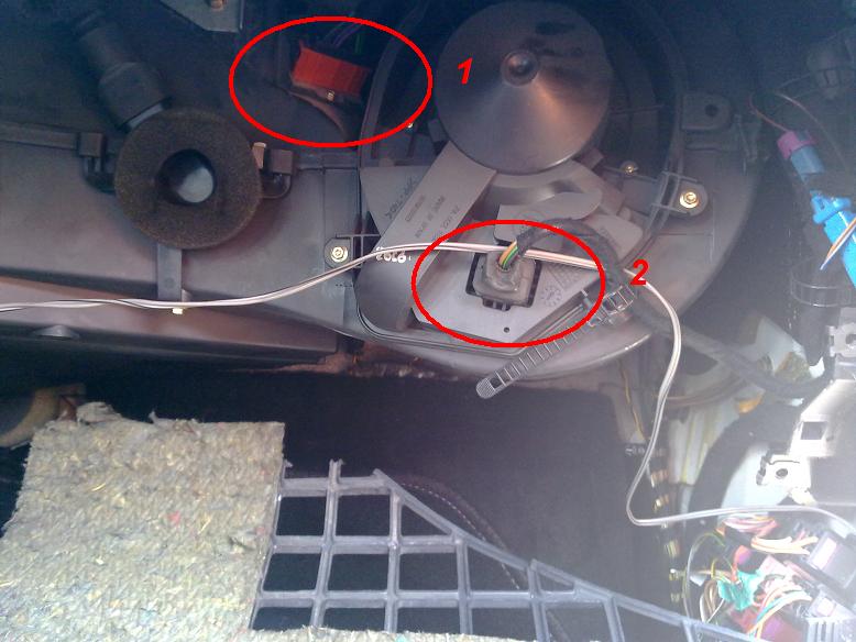 Оправих. Сваля се жабката и под нея е блока на климатика. Проблема е във въпросния предпазител. Намира се под куплонга номер 1 на снимката, който влиза в климатичния блок. Другия 2 е захранването на вентилатора. Цялата философия е сваляне на жабката и след това куплонга, под него е джаджата. Държи го едно болче звезда '20. Резистора струва 1,50лв. до 250 градуса е.