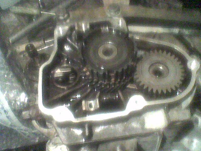 като изключим избирача, пружина има единствено на вилката за задната. Тази пружина като се счупи, зъбното колело за задна почва да опира в зъбно колело на първа и се получава онзи шум. Освен че дразни, друго неможе да направи, тъй като няма какво да заключи двете зъбни колела