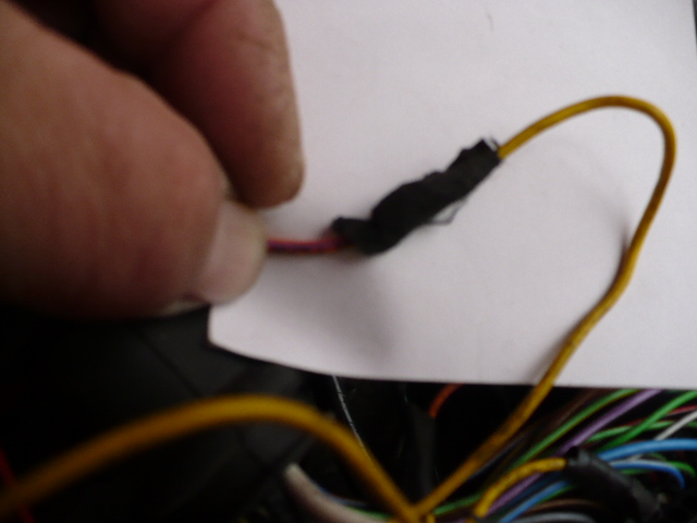 прекъсва следните кабели:червен.оранжев с лилава ивица,лилав като при него има и черен който е отрязан свободно,двата са със общ екран.