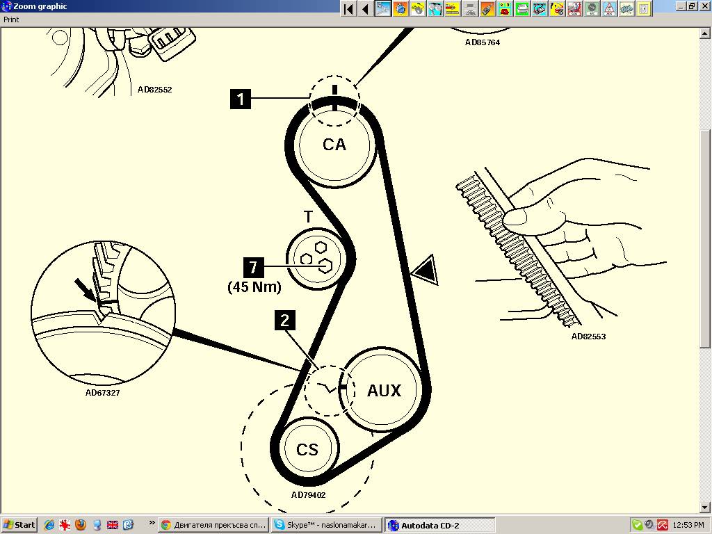 Подкрепям горното. Моят боб показва, че е възможно маалко да са се разминали белезите при новото зацепване на ремъка (стават грешки понякога, важното е да си ги признаваме, ако проблемът е наистина там, бих ти го оправил безплатно, ако съм "майстор" дето ти е ремонтирал колата преди това). Отиди да ти ги погледнат, ако искаш преди това можеш да си ги видиш сам, не е много трудно, но ще ти трябва втори човек, който да ти помогне да ги нагласите (единият бута колата на скорост, другият гледа белегът да дойде на място). Ето схемата, по картинки е лесно, смятам, че ще се справиш. Също така като я докараш на белези виж за по-сигурно и маховика, въпреки че ме съмнява да има несъответствия в долната част на белезите на мотора