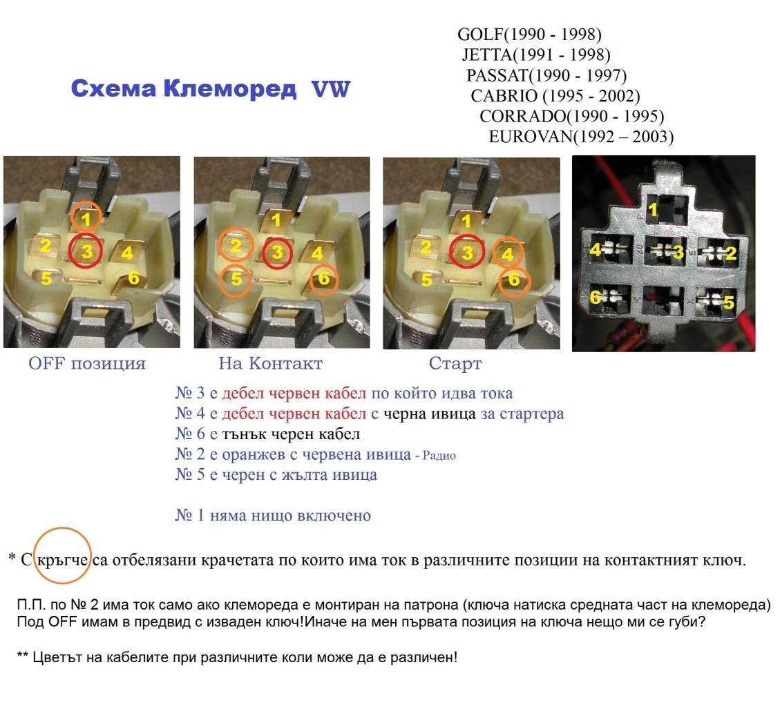 Колеги моля за помощ. Пасата е комби В3 1,8моно ABS мотор. Преди време спря да пали в смисъл въртиш на стартер нищо открихме проблема в клемореда направих си старт бутон през реле и бушон и всичко беше ОК до онзи ден. Пасатко изгасна в движение даваш контакт нищо не светва по таблото а като завъртиш на стартер върти но не пали. Посъветвах се с приятели и всеки вика клемореда да ама за да съм сигурен откачам куплунга на клемореда и след консултация тук във форума разбрах кой е постоянния плюс и започнах да подавам на другите клеми плюс. Странното е че от време на време таблото светваше и колата палеше и след малко гаснеше сама и контакта изчезваше. След проба разбрах че клемореда работи и дава контакт. Явно проблема е след него по жиците и нататък. Намерих тук една схема на клемореда,но не разбрах всеки кабел къде отива. Моля ако някой знае да пише кабелите къде отиват.Аз ще се опитам да ги проследя кабел по кабел.