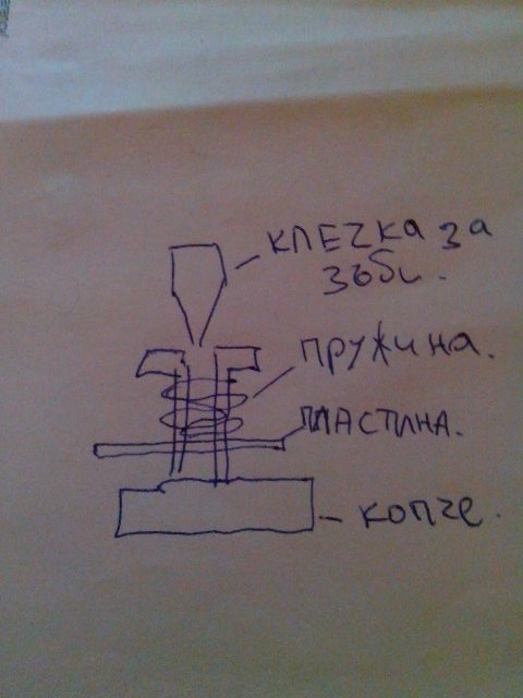 тя седи под пружината и предава движение включено и изключено