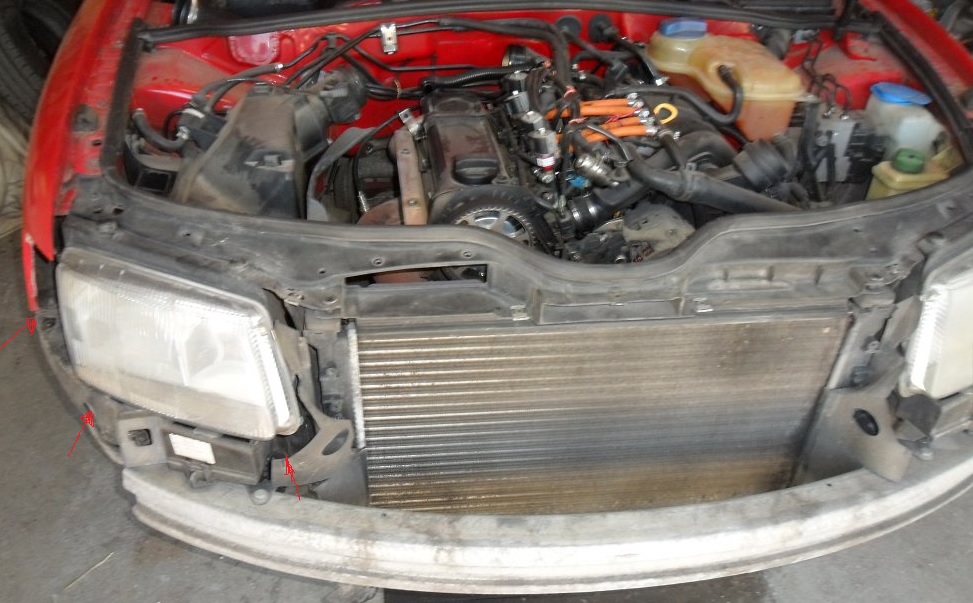 За да се свали алуминиевата броня е необходимо първо да се свалят черните платмаси под фаровете. Те се придържат от два торкс 25 винта под фара и един болт при калника (виж стрелките на горната снимка). Щом сме свалили пластмасите под фаровете - вече можем да развием болтовете, които стягат алуминиевата броня на масто: