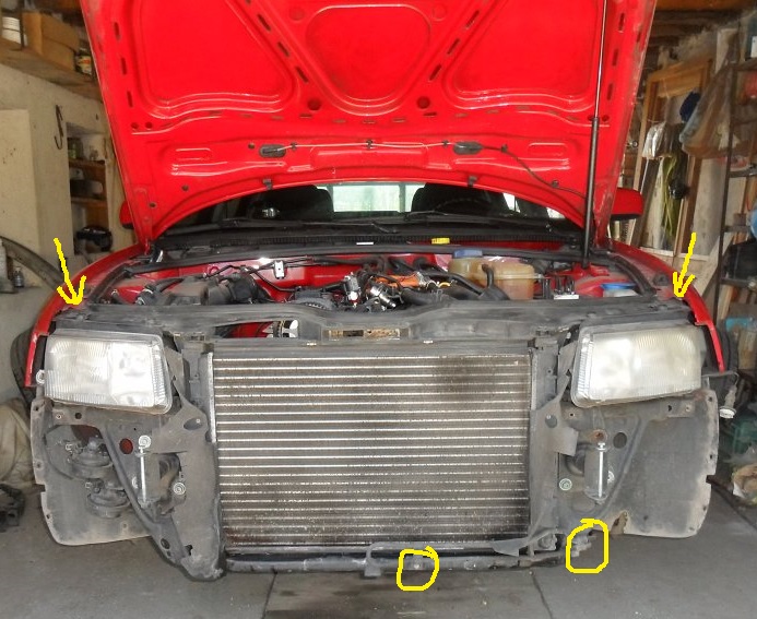 Щом сме сигурни, че всички кабели са разкачени (класон, фарове и др.) можем да пристъпим към развиване на двата болта (стрелките на горната снимка), които придържат предницата на място, след като свалим носачите на алуминиевата броня.
