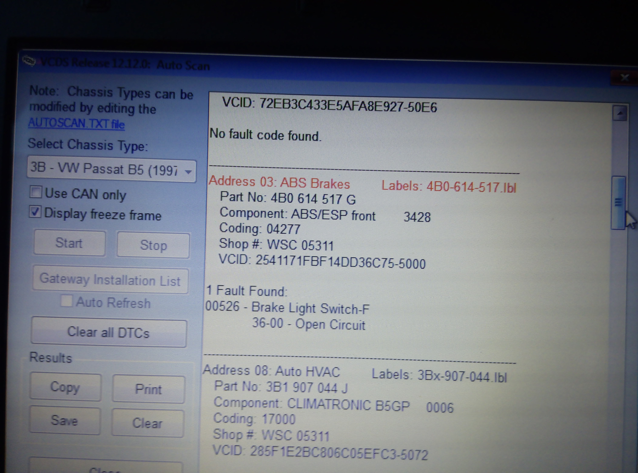 Отначало проблема се появяваше само при потегляне на колата(веднага започваше да свети лампата за ESP, не ABS). След като се изгаси и запали наново двигателя и колата е в покой, няма проблем. След около ден ,два започна да свети постоянно, независимо дали се движа или не( щом запаля започваше да свети). Закачих я на компютъра и извади грешка :exclaim :exclaim :exclaim 00526 - brake light switch-f - open circuit( от снимката) :exclaim :exclaim :exclaim . Започнах да се ровя в нета и видях, че може да се дължи на няколко неща( стоп машинка, датчик на ABS, прекъснат кабел и ред други). Тогава се сетих, че преди няколко дни мой приятел каза, че не ми свети левия стоп. Свалих всичките 10 крушки и започнах да ги меря с мултицета една по една. Оказа се, че и от двете страни имам по една частично изгоряла крушка( частично, защото те са с по 2 жички.....за габарит и при натисната спирачка). След смяната им с нови проблема с лампата за ESP моментално изчезна.
