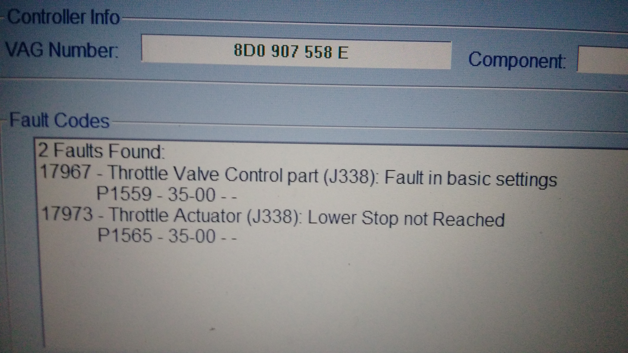 Преди няколко дни имах малко проблеми с оборотите - В движение като изключа от скорост играеха между 500-1000 а при спиране на място се нормализираха) и реших да проверя за грешки с Vag Com и ми излезе това: