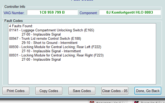 1вия - багажника не се отваря от никъде освен от ключалката ( от вратата и от дръжката на багажника НЕ се отваря в всякаква позиция на ключалката ) евентуално къде може да е проблема? Прилагам и код на грешките който са записани от VCDS-то.
