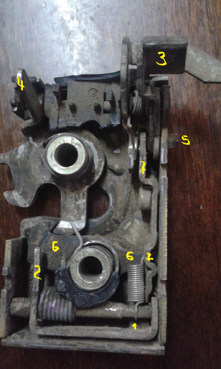 С №2 съм отбелязал лоста,който дърпа вътрешната дръжка за отваряне.Дръпвайки го,задната част на въпросния лост- №1 директно избутва лоста 7,който пък избутва задната част на №6 нагоре,при което предната част на 6 слиза надолу и освобождава ключалката.При тези движения чопчето 5 си се движи,понеже и 7 с движи.Но при заключена врата/4/,лоста 7 се премества в горния край навътре/освобождава лоста 3/,като долния му край пък излиза навън и така и 1 не му оказва никакъв натиск.Само при това положение чопа 5 не с движи,понеже няма кой.