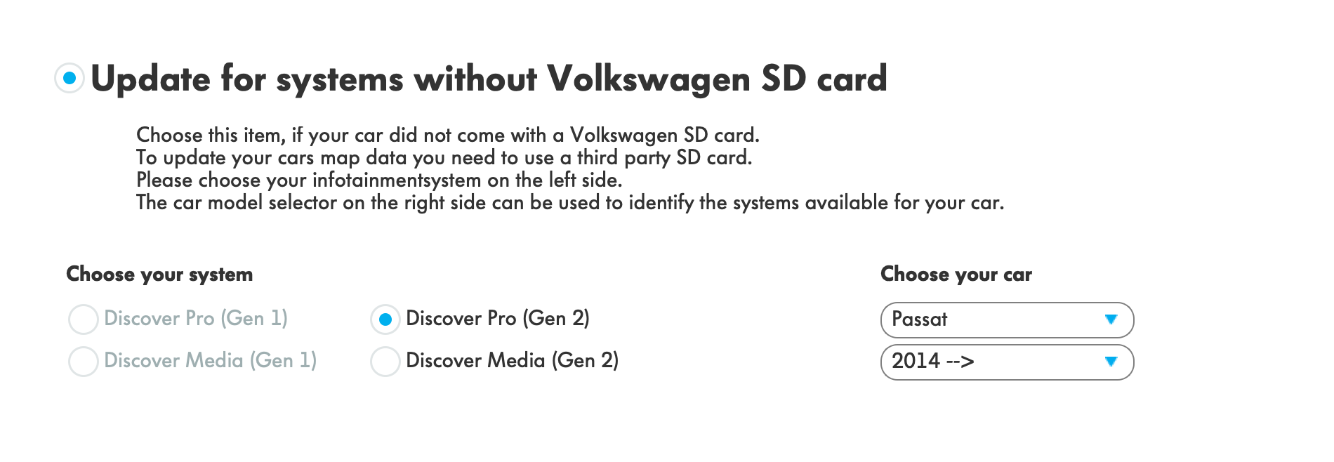 Днес докато ъпдейтвах картите през VW DiscoverCare ми даде да си избера модел автомобил и година -->2014. Тогава като избор на система остана само Discover Pro Generation 2.