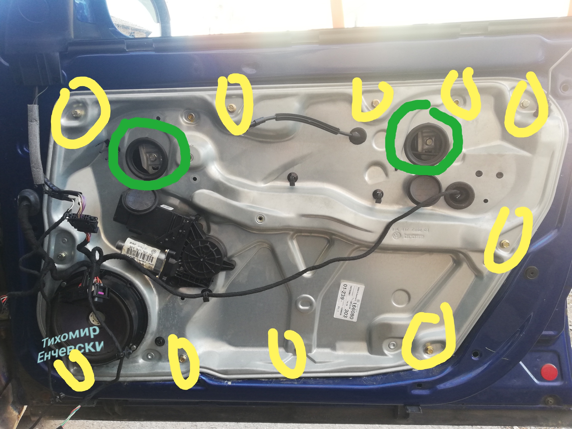 3 Сваляме прозореца за да е покажат двата болта. Отхлабваме ги за да освободим прозореца. Повдига се нагоре и се подпира или се маха напълно. През това време и до края на процедурата не се натиска копчето за Ел прозореца за да не се размести положението на водачите.