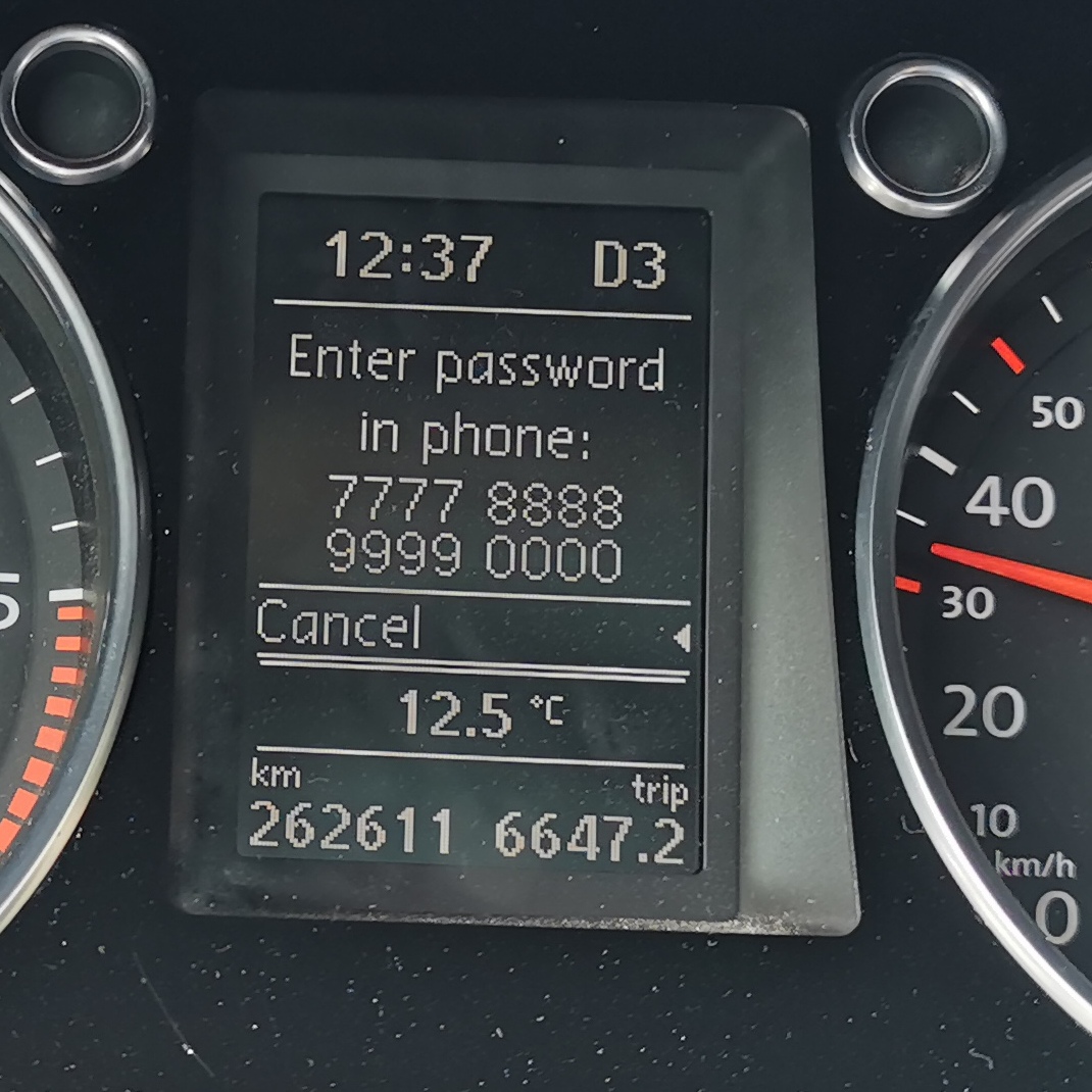 Здравейте, от скоро имам колата и първоначално нямах никакви проблеми да свържа моя и на жена ми телефона към колата. Но сега когато превъртя на менюто където да свържа телефона стои кода за потвърждение който се въвежда, само че телефоните въобще не могат да видят колата (вж. снимката). Случвало ли се това на някой, как да реша проблема?
