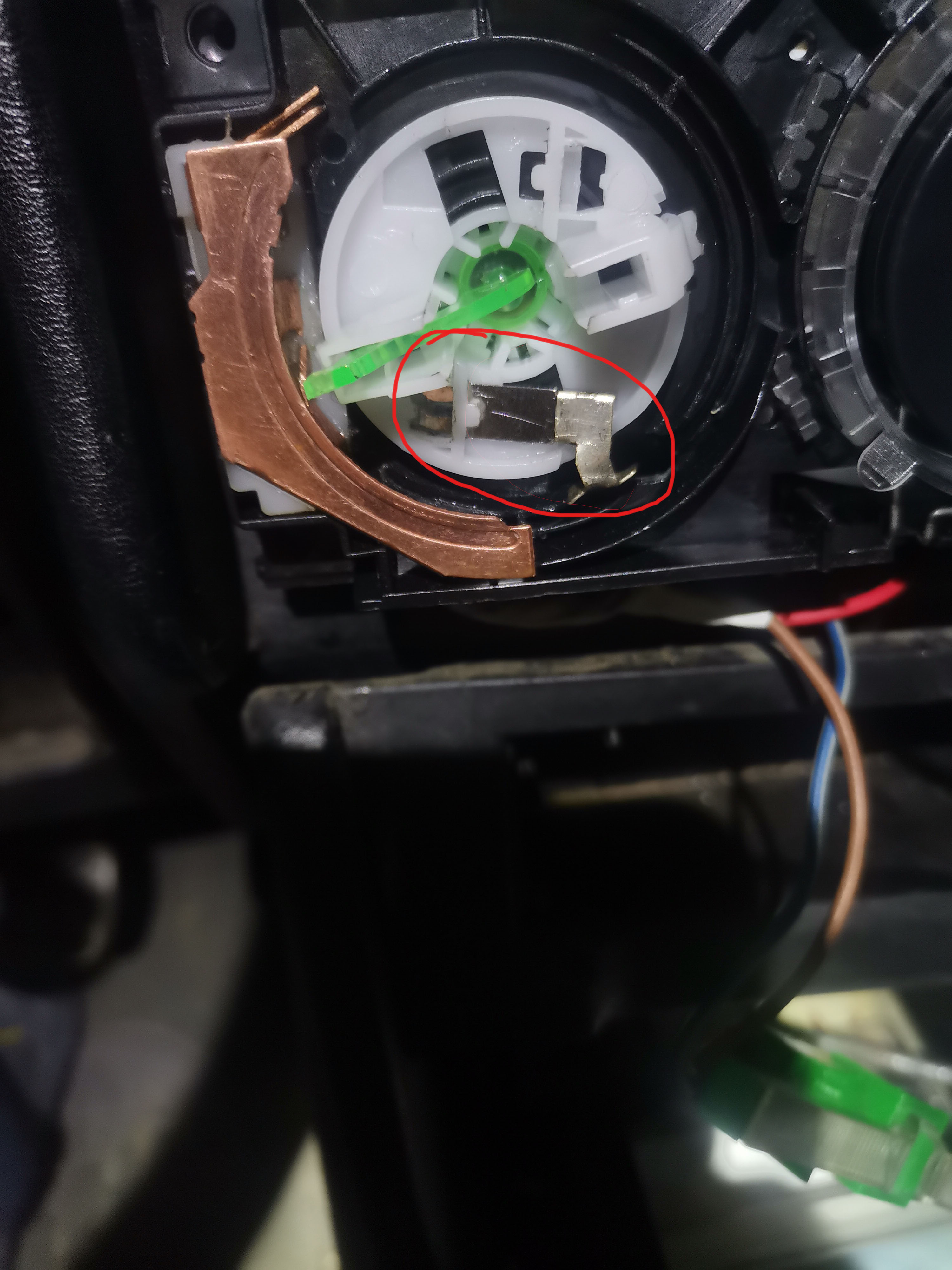 Разглобих го и видях, че тази пластина се е огънала. Може би при многобройните вадения и слагания на този панел съм я притиснал и сгънал, не знам. Тя прави верига и включва степените.