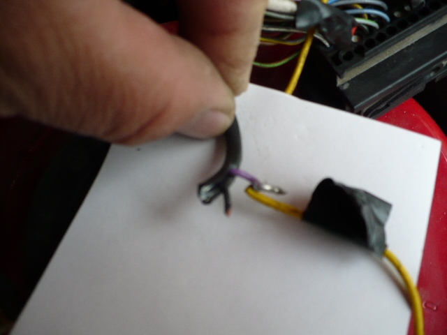 прекъсва следните кабели:червен.оранжев с лилава ивица,лилав като при него има и черен който е отрязан свободно,двата са със общ екран.