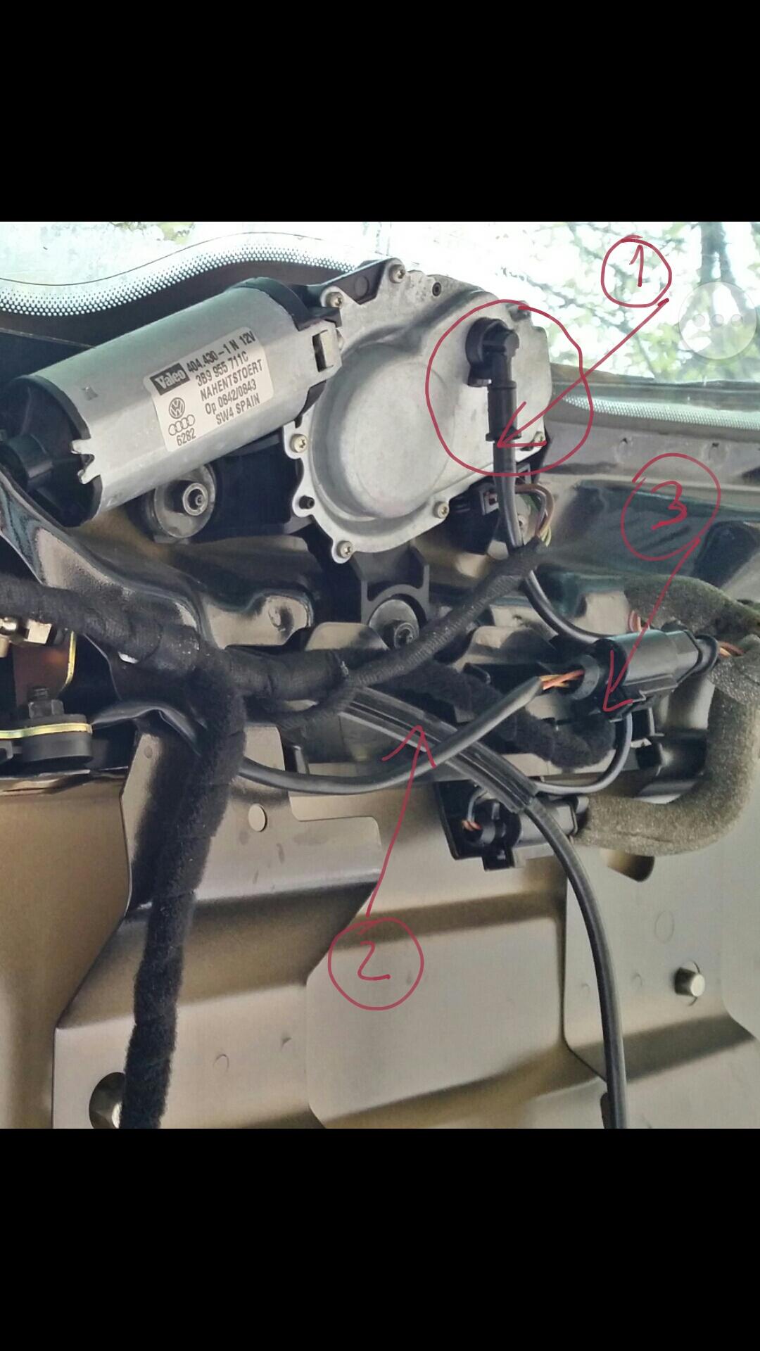 Колеги,след като два дена бях с разкачен акумулатор,понеже се включваше алармата,днес махнах кората,там където съм отбелязал с 1 мисля,че е проблемното място,понеже около него всичко беше сухо,а там е най-високата точка намокрено,на 2 и 3 беше най-мокро.Откачих кабела до бравата,който според мен подава сигнала за отворена врата на дисплея/добра идея ли е,понеже като отключа и отворя само багажника,всичко се заключва,но поне няма да ми бие гонга при евентуален бъдещ проблем/.Според мен снадката 1 е виновна,беше леко с луфт,продухах маркуча и я сложих плътно.Дали съм решил проблема и този разкачен кабел,така ли да го оставя?