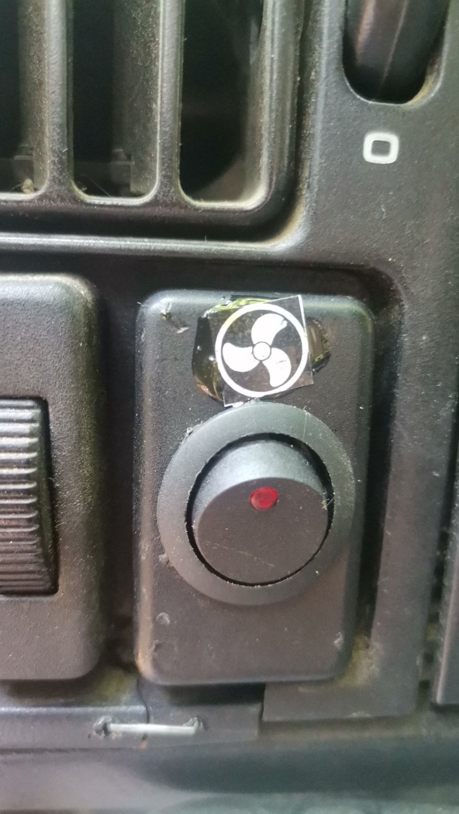 Да ви покажа набързо какво направих на стария Пасат Б3. Понеже понякога стига 100 градуса, подозирам, че перката не включва винаги. Затова направих две модификации - на таблото използвах гнездо оставено за лампичка и в него сложих светодиод, който светва, когато се включи перката на охлаждането. Също така сложих ключ, който да включва втората степен (вързан през реле 12V/40A). Kaто тръгна на баир да качвам на първа, направо го включвам, не чакам да загрее...