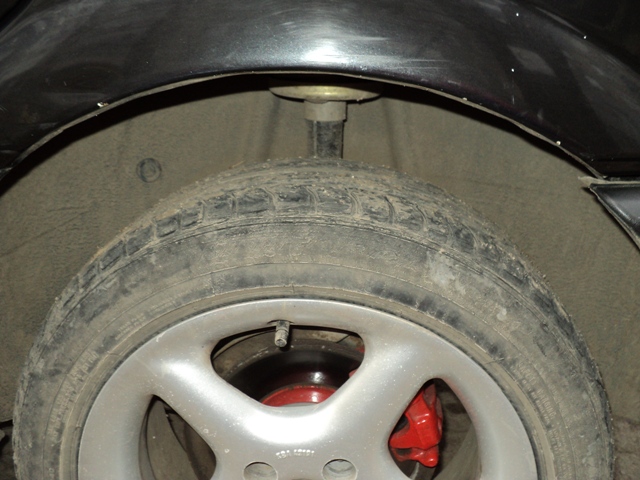 Ето сега снимах разстоюнието между гумата и калника,вижда се и амортесьора.Да не задира в чашката на амортесьора като седнат двама души отзад?