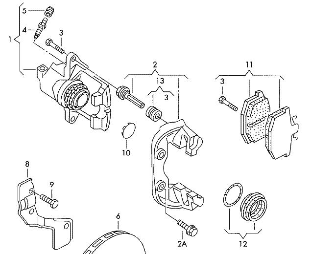 Аз съм с вариант 2 са 282 или 288 дискове, там системата е ATE. При нея водача представлява метална втулка, която е навита в супорта и на апарата има гумена втулка, която се движи по металната и така се движи апарата напред-назад. Там се продава ремонтен к-т с гумена и метална втулка и всичко може да се направи като ново, без да сменяш апарат или супорт. Между другото наскоро установих, че много лесно се минава от 282 на 288 при тези спирачки - сменя се само супорта и нови дискове с накладки...всичко става 1:1 и апарата си е същия. Оказа се даже, че 282 диска е доста по-скъп от 288 :) .Преди да сменяш водачи и т.н.,пак трябва да си убеден,че гумата е здрава и се движи добре по водачите,защото иначе пак ще заклинва.Пружината с номер 4 на картинката също е от много голямо значение за правилната работа на апарата и за това накладката да ляга правилно по диска - ако я няма или е много мека - ефекта пак е кривене на апарата.