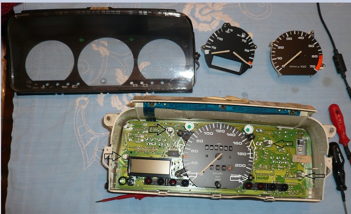 Изваждате оборотомера и уреда за (температура и бензин), като ги издърпвате нагоре, те не са хванати с винтове, а са монтирани на по-два бели водача показани на снимка 6 със черни стрелки, докато километража е захванат със 4 винта показани с бели стрелки. Също така трябва да развиете и винта показан с червена стрелка на снимка 7. Това е винта който държи стабилизатора на напрежение.
