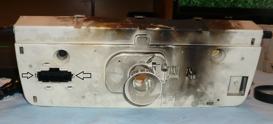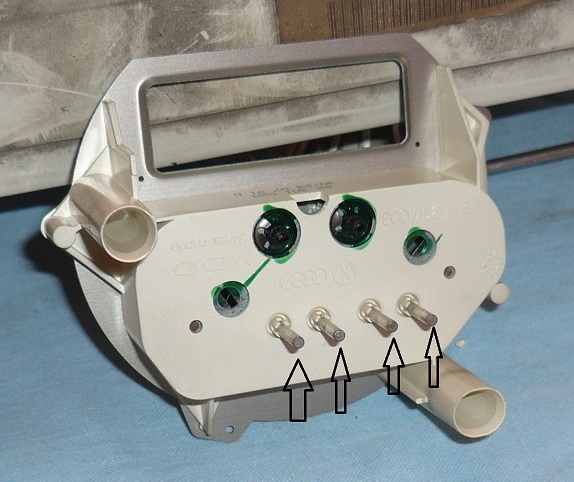 Ваденето на платката става като се освободят закопчалките показани с черна стрелка на снимка 7 и още две на куплунга от другата страна на таблото, показани на снимка 8. След като извадите платката внимавайте да не повредите синята лента която свързва платката с трите крушки.