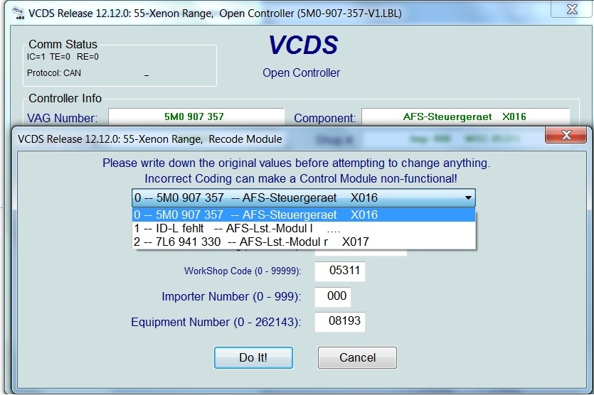 Ето и резултат след опита за кодиране, дава грешка и не иска да кодира. Направих адаптация която мина успешно на половина и грешките вече са пет. Направи ми впечатлиние обаче, че в диалоговия прозорец не се вижда номера на модула в левия фар. Вече съм почти убеден че проблема идва от него. Прилагам снимка и лог файла от днес.