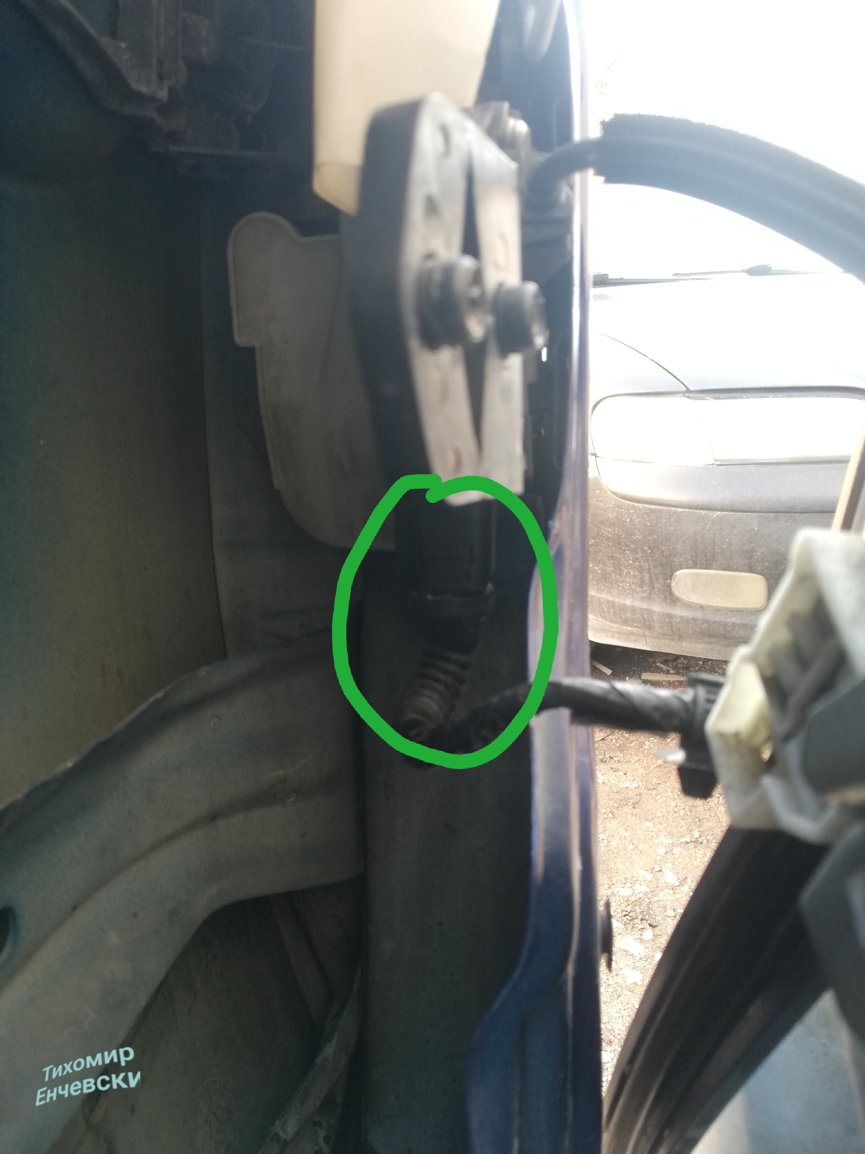 3 Сваляме прозореца за да е покажат двата болта. Отхлабваме ги за да освободим прозореца. Повдига се нагоре и се подпира или се маха напълно. През това време и до края на процедурата не се натиска копчето за Ел прозореца за да не се размести положението на водачите.