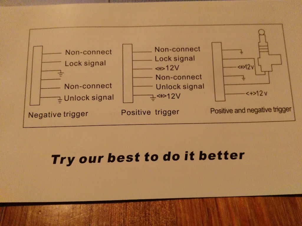 Свързах го към бравата на шоф.врата по схемата вляво от упътването както каза колегата swifter.От бравата излизат кабели два от които са за откл. и закл. -при мен са червен/зелен и червен/син.Открих ги малко с налучкване тъй като не открих схема