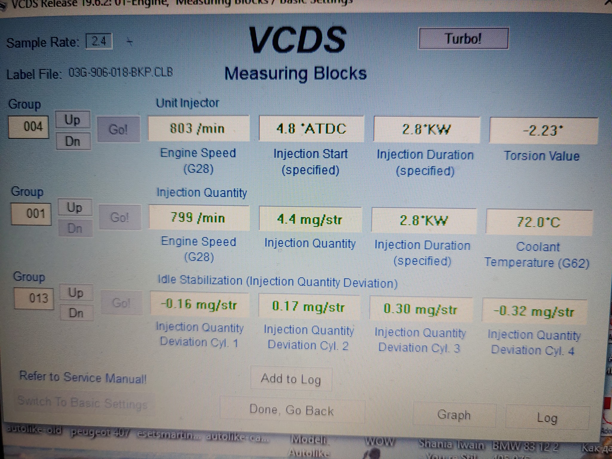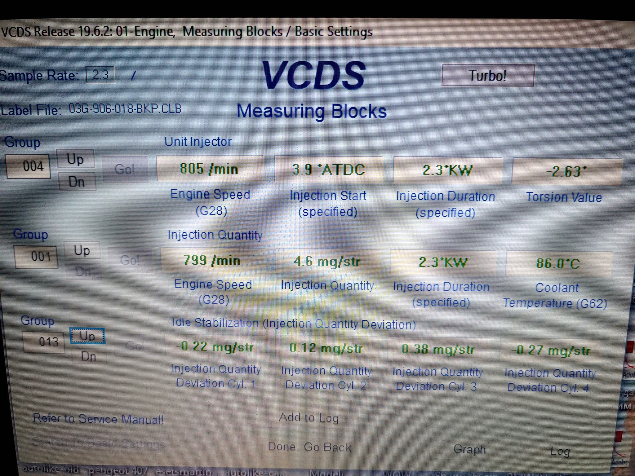Здравейте колеги. Притежавам Passat B6 2.0 TDI 16V BKP. Питането ми е правилно ли е зацепен ангренажния ремък според показанията на VCDS за центровка. Сменен е преди 1 седмица. Притесняват ме показанията на 4та група, 4ти канал - -2.23. Няма записани грешки. При вас какви стойности показва ?
