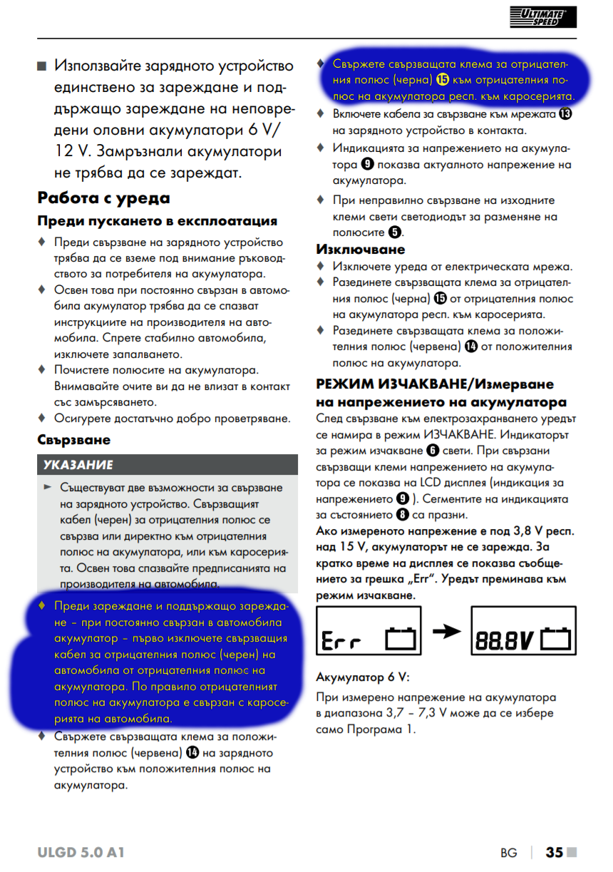 д) след края на заряда изключвам зарядното от мрежата, разкачам кабелите, закачам обратно черния кабел към акумулатора.