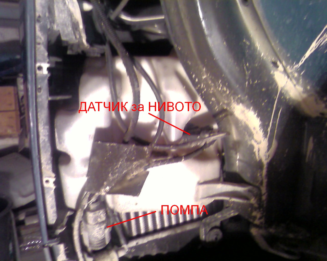 Тръгвам-светна датчика за течност на чистачките ;-)- викам си хубо-миналата седмица слагах, ама може да съм прекалил с прането на стъклата ;-) Обачее-установих (след като стана малко по-сухо), че под предната гума-гьолче, от колата отпред на подкалника-мокро и капе, отзад-чисто сухо.Гледам баката за чистачките-хем я напълних-пак празна-наливам... и след 10 минутки: 1см(в гърловината) водата я няма. Щом я нямаще нацяло преди - значи някъде на дъното има пропуск.