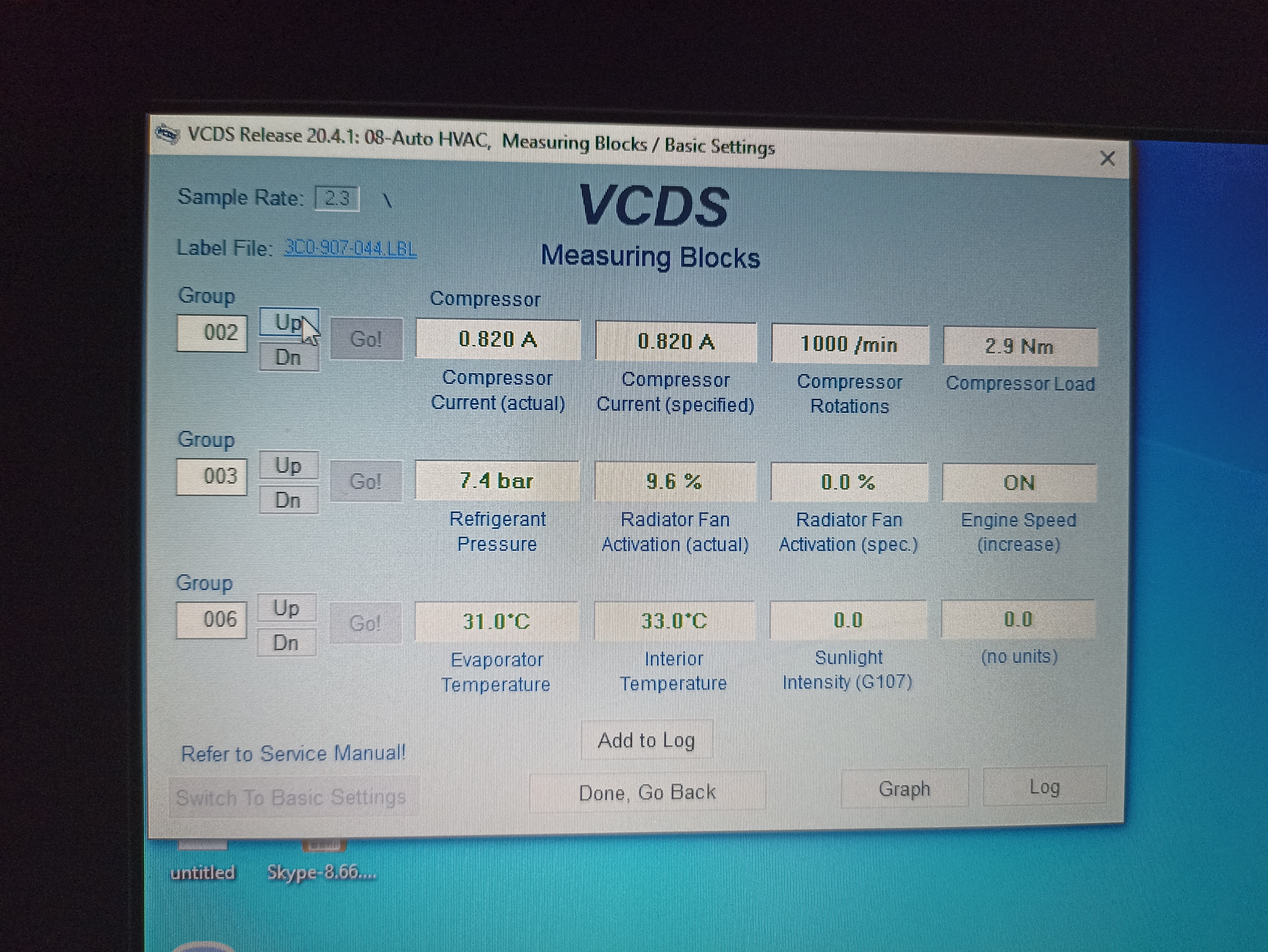 какво трябва да е налягането на фреона? Това лято пълних климатика и след седмица рязко спря да работи, а сега тръгва понякога и то слабо. Пуснах VCDS но не виждам разлика с включен или изключен климатик. Прикачам снимка с включен климатик, ако може някой да разтълкува показанията ще съм благодарен.
