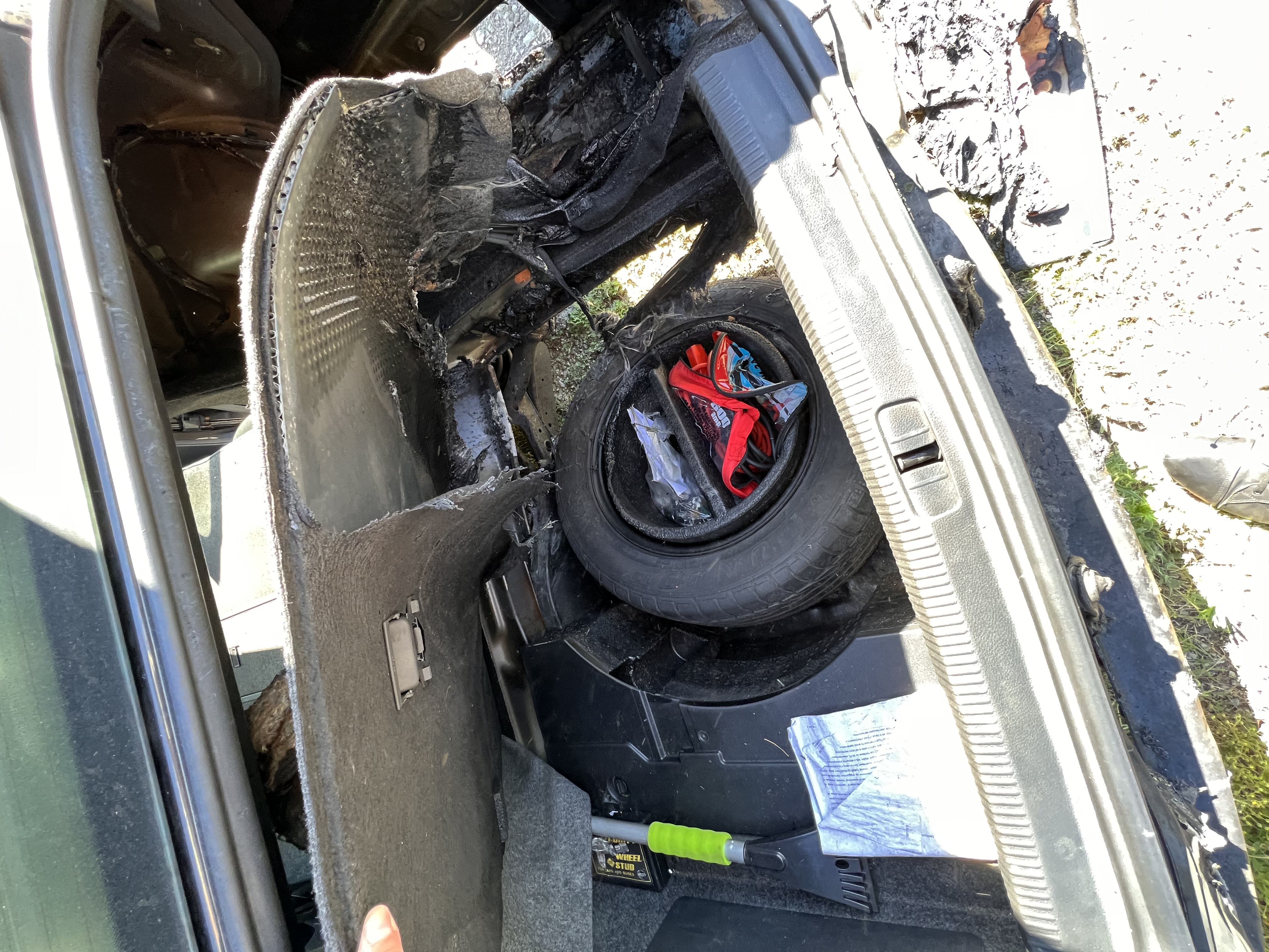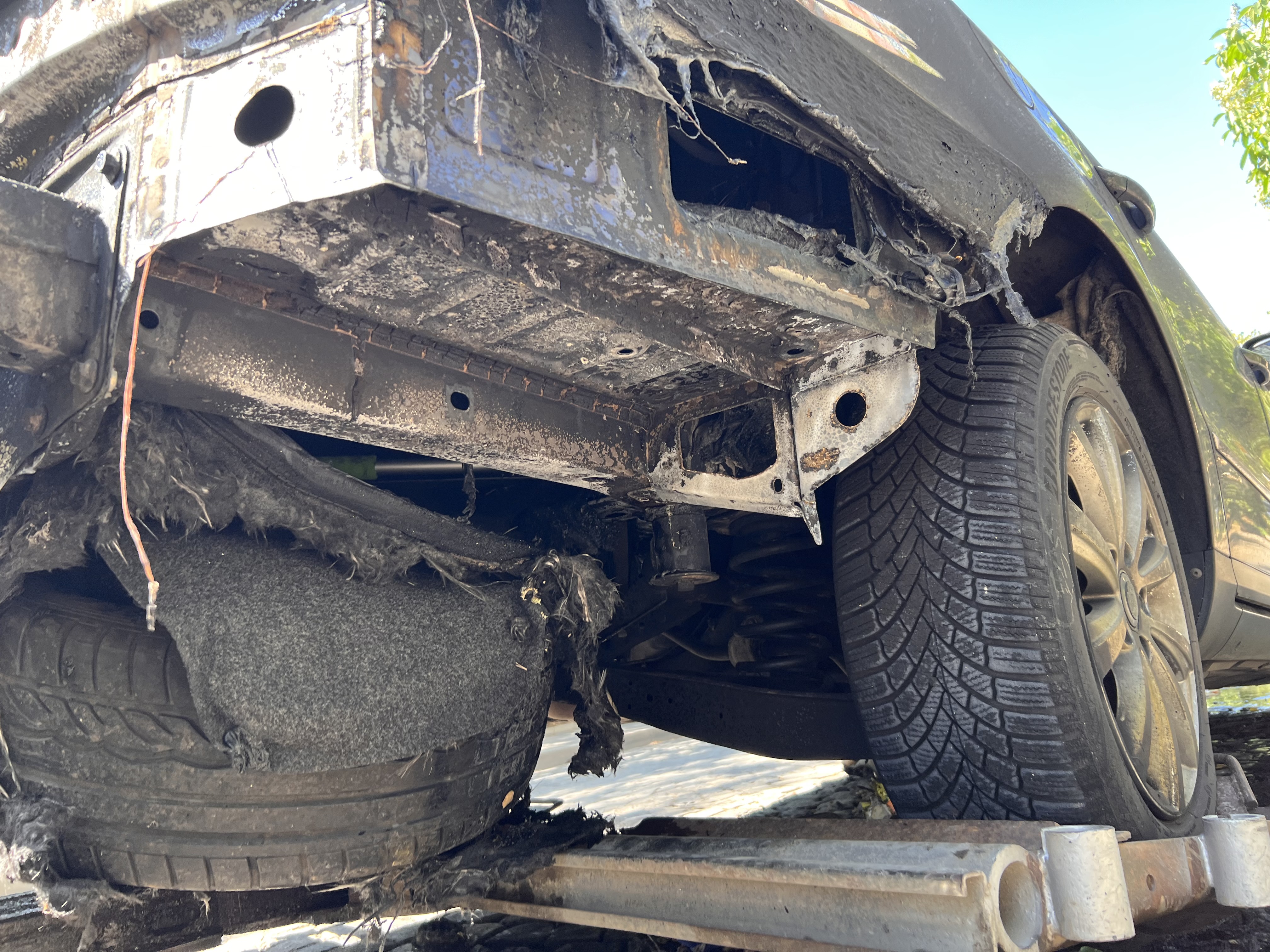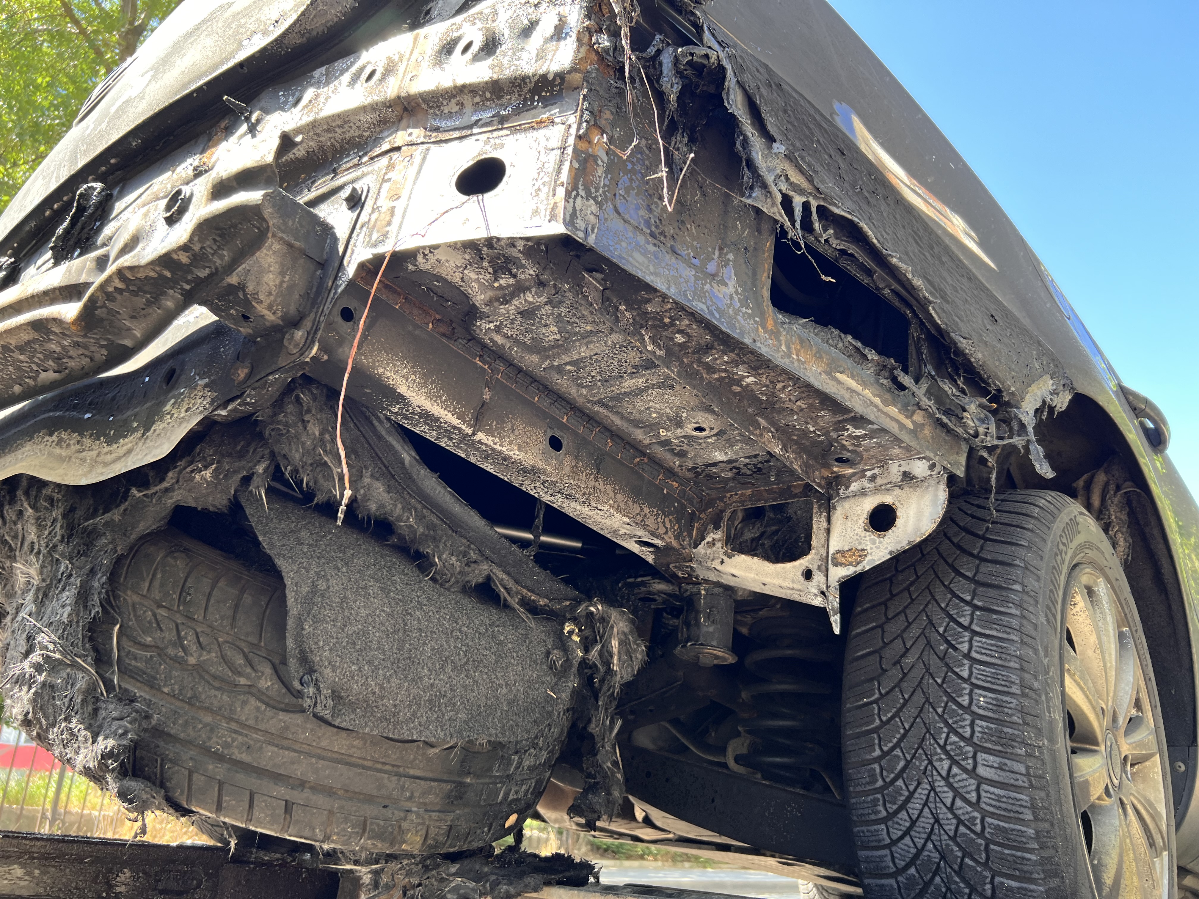 Огъня е в багажното отделение в дясната част на колата. Не е засегнал седалките, което е добре. Реално основните поражения са в дясната част, като там пода е стопен, както и съответно цялата задна броня.