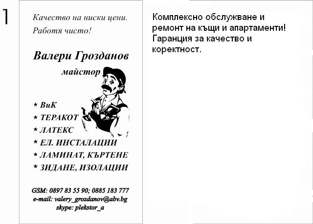 JaDaWiN написа:Търся си работа за сезона. В момента съм студент в ТУ-София. Завършил съм Първа английска гимназия в София, така че знам езика на едно сравнително добро ниво. Имам добри компютърни познания; учил съм една година С. Работил съм на поточна линия, както и хаусмен. Предпочитам работа с компютри, но съм съгласен и на охранител, продавач, рецепционист и общо взето каквото има.