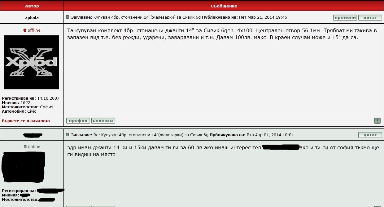 джантите имаха опция за преглед във Еконт,можело е да си доведе въпросният гумаджия и да го осведоми на място че няма да станат,всички гумаджии имат уред за мерене на междуболотовото разстояние както и уред за измерване на ЦО,или по примитивен като шублер !!! и второ предложения по ниски от 70лв,трудно би било на по ниска цена защото,няма как,мисля че може да съм некоректен ако съм му изпратил джанти който са криви или,изправяни и т.н но джантите който е получил колегата,бяха точно за колата му,но няма да коментирам повече,ето това не харесвам на онлайн търговията винаги някой се чувства изработен,а то не е така,винаги се търси евтиното после,продавача е бил виновен :)