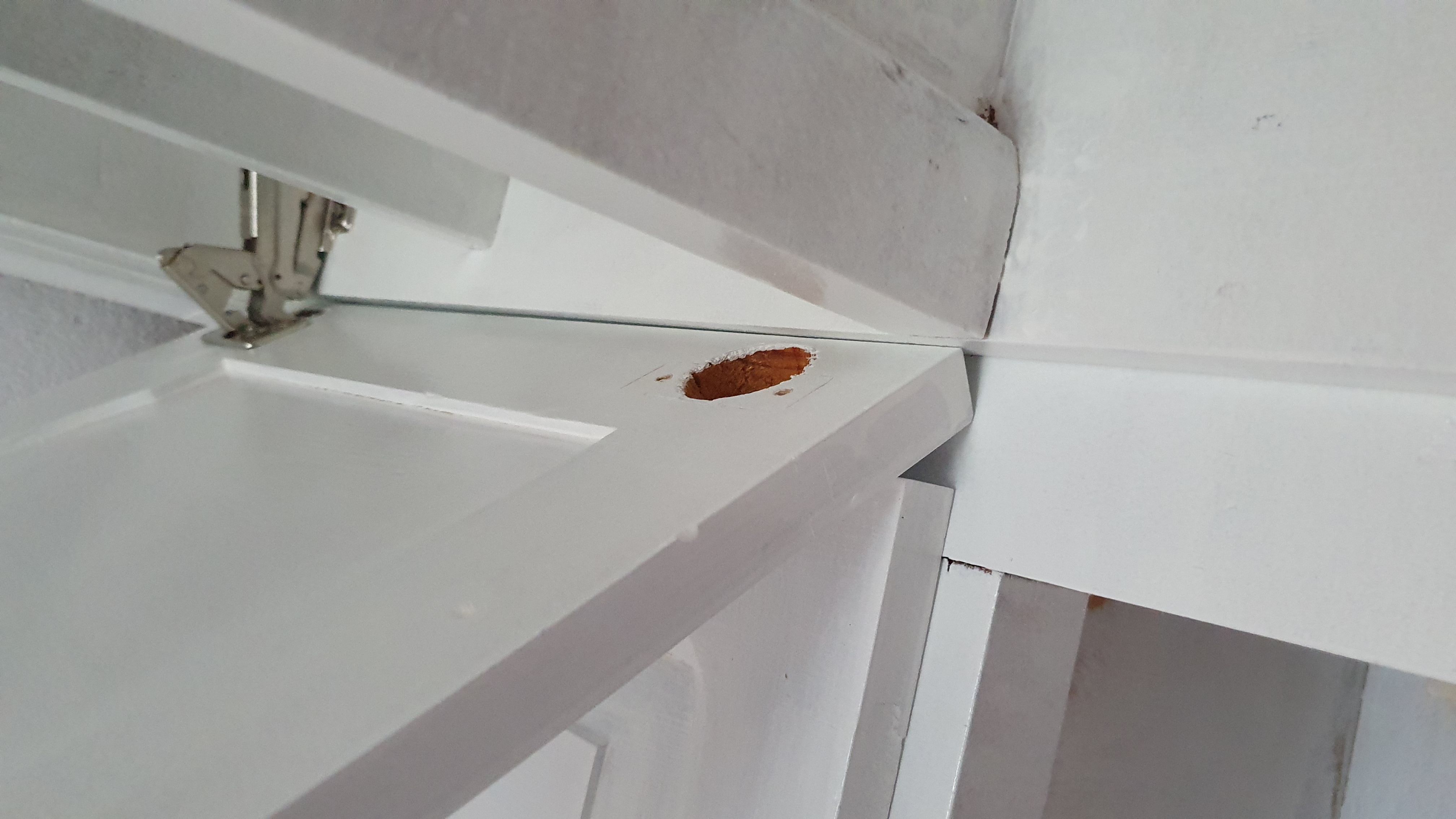 Кухненското е от предишното ми жилище, качествена изработка, чам. Наложи се разместване на модулите на горния ред и затова се появи този проблем в ъгъла, който ще разреша по някакъв начин... иначе след монтажа ми остава още едно финално пръскане с боя и поставяне на дръжки.