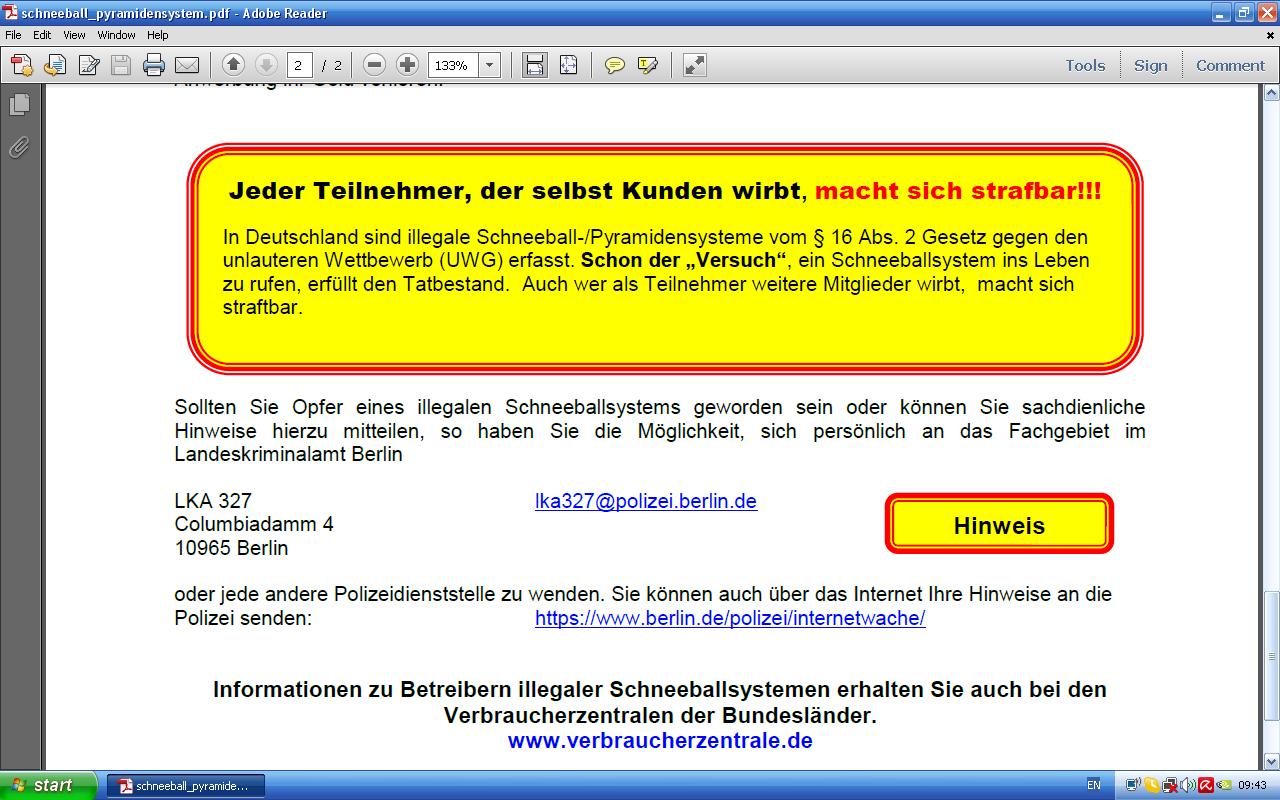 Накратко: от 2004-та година насам в Германия бизнес като вашия е ЗАБРАНЕН чрез допълнение на Закона срещу нелоялната конкуренция, опитът да се организира такъв се наказва със затвор до две години или глоба, на санкция подлежат всички участници в пирамидата, били те тарикати или излъгани. Подобни закони са въведени в Австрия и Швейцария. Други въпроси имаш ли?Re: Компания тип пирамида?