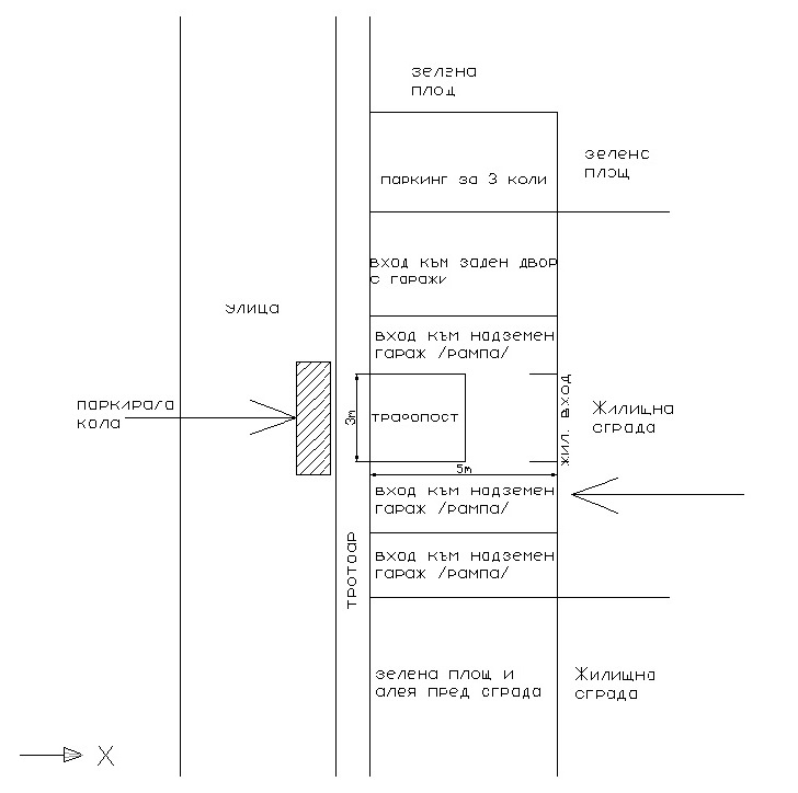аз съм с гаража дето е посочен със стрелката. Проблема е когато някой си спре МПС-то по начин посочен на картинката, и особено ако комшията ми по гараж си е оставил колата на рампата пред гаража. Е тогава е меко казано гърч да си паркирам колата в гаража. Играя си на вдигане на чистачки, бележки и др. все учтиви начини. Същото го практикува и съседа от другата страна на трафопоста. До тази неделя. Прибираме се от разходка с децата и едно Г3 ГТИ цъфнало пред трафопоста. Спираме си на рампата и отивам и му дигам чистачките, когато някой извика "Ей Коп...енце" стой там". Седя си, но понеже децата щъкат постоянно (2г.) и държа едното на ръце. Та слиза един батка, готов на саморазправа и се завърза спор кой как да спира, пречи или не пречи и тн...поспорихме с него, с жена му (вероятно) и още един човек, които седяха на прозорците и се включваха от там епизодично. Както и да е и двамата прекалихме с приказките тогава, а можеше тихо и кротко да се разберем без викове и тн...