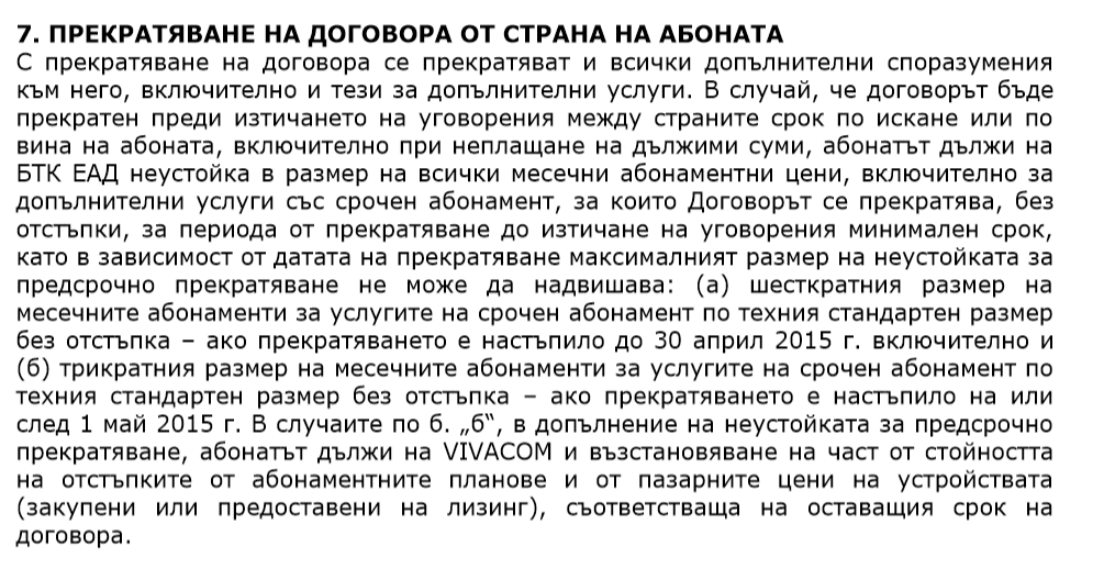 6 или 3 месечни такси е неустойката, извадка от договора на Виваком.