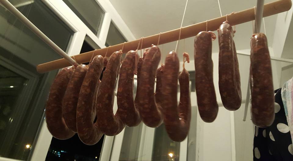 Аз правя следните мезета за зимата. Първото което което най много харесвам с руйното домашно винце е тънко нарязана домашна наденичка сурово сушена на терасата в период за около месец :mhihi , за целта: