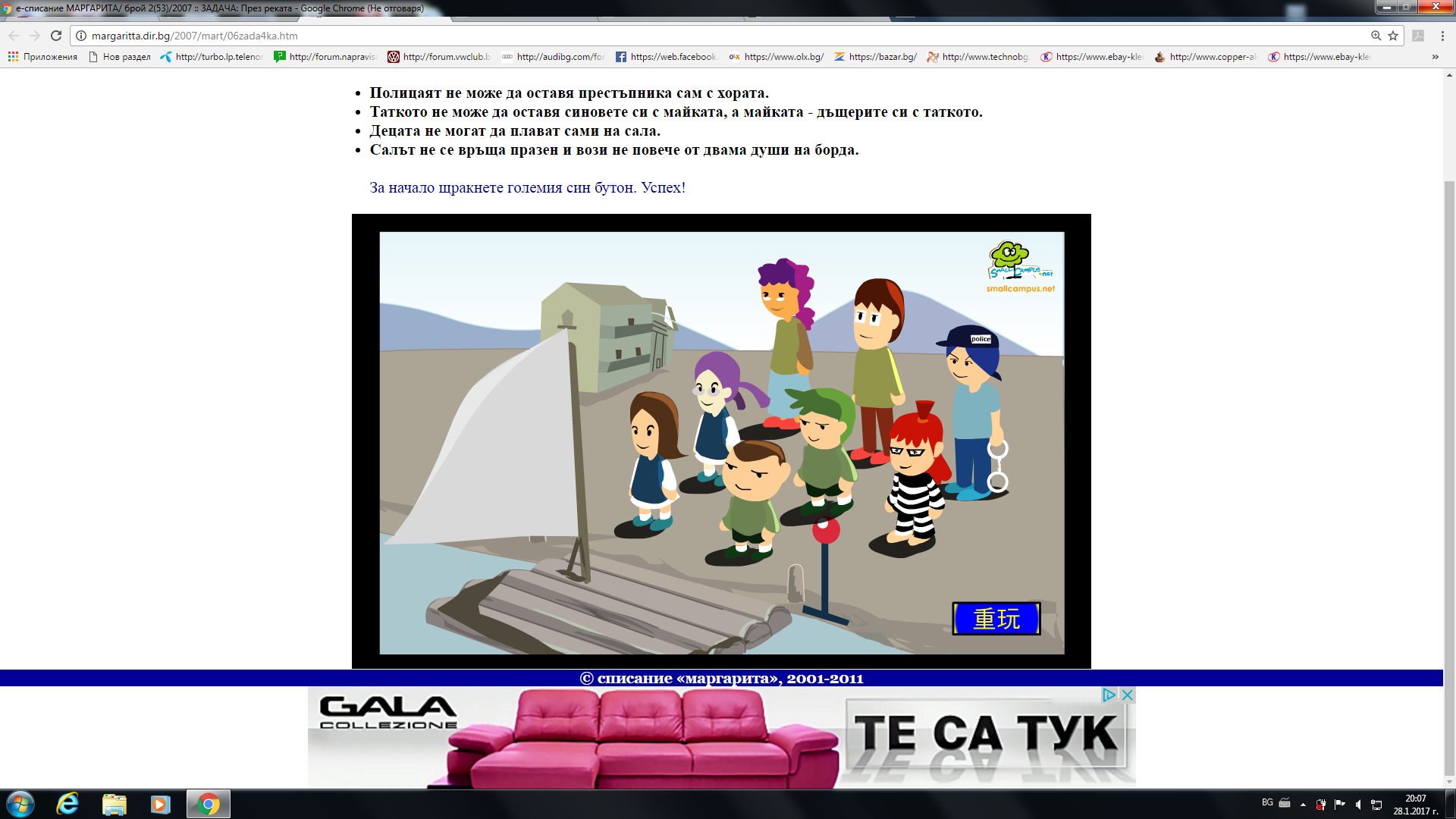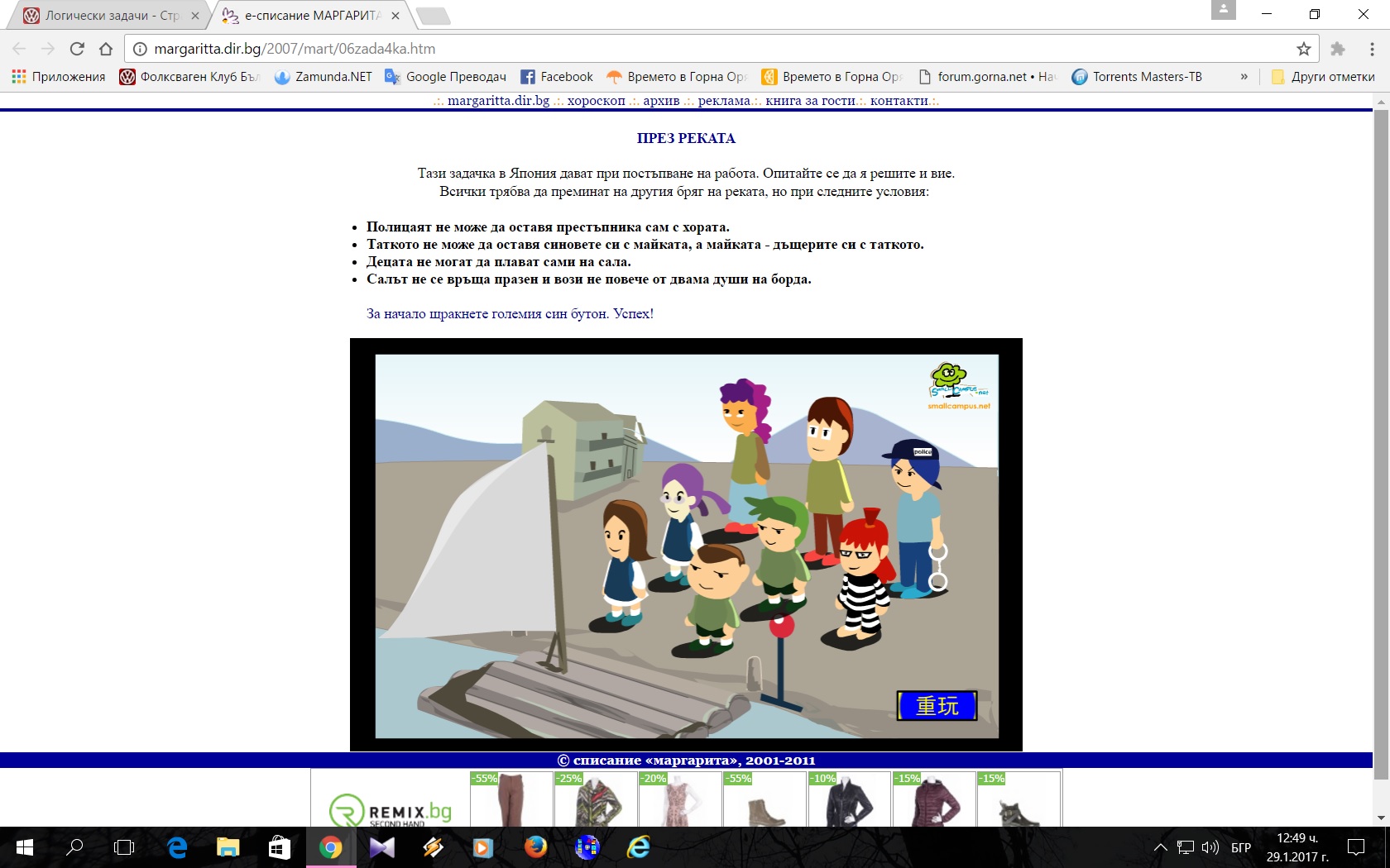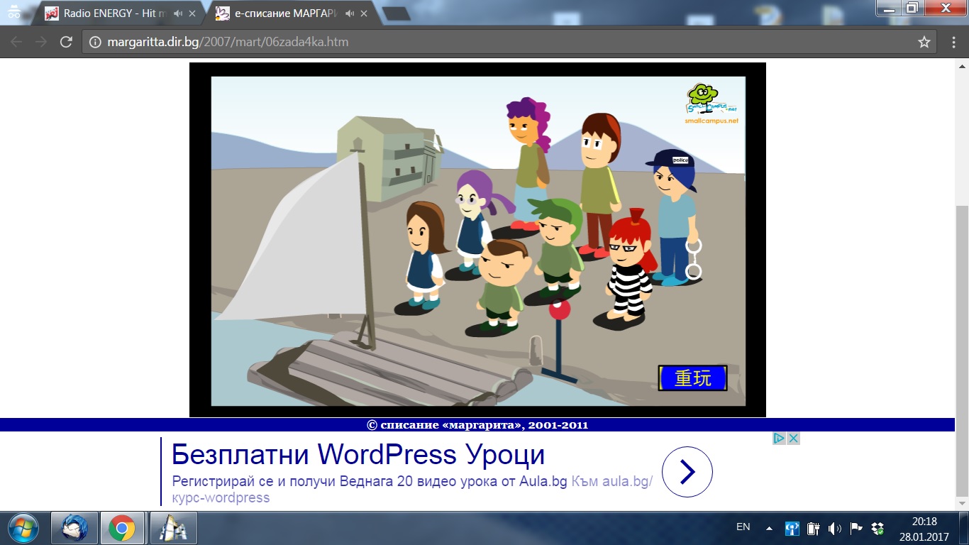 Имаме мост и от едната страна стоят 4 човека. 1ят може да премине моста за 1мин. 2ят за 2мин. 3ят за 5мин. И последният за 10мин. Мостът гори и ще падне след 17мин. Целта е всички да преминат. Как ще стане?