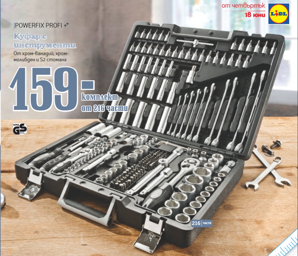 В немския Лидъл го хвалят: http://www.lidl.de/de/powerfix-werkzeugkoffer-216-teilig/p196310?searchTrackingQuery=Werkstatt&searchTrackingId=Product.196310&searchTrackingPos=95&searchTrackingOrigPos=77&searchTrackingPage=3&searchTrackingPageSize=36&searchTrackingOrigPageSize=36
